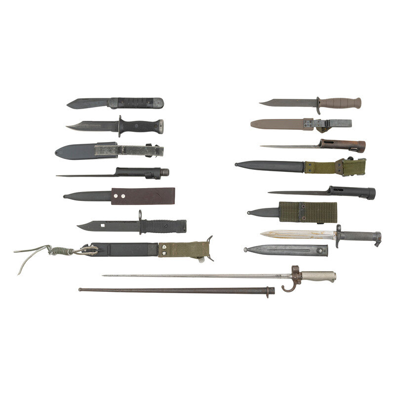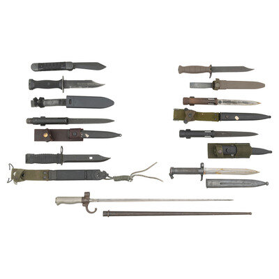 3-5.) Three FN FAL type C bayonets with scabbards. One with leahter frog, one nylon frog, and one with a nylon hanger. No visible markings. One has an FAL muzzle device inserted.