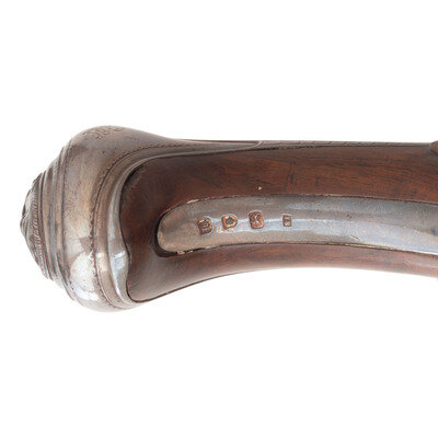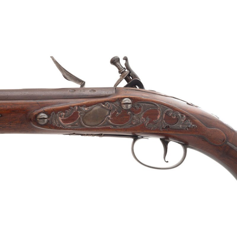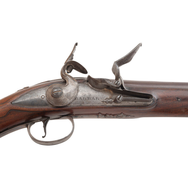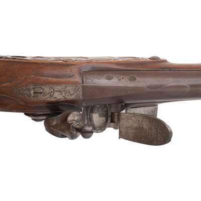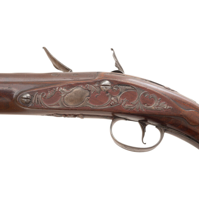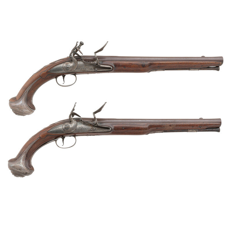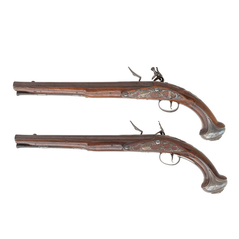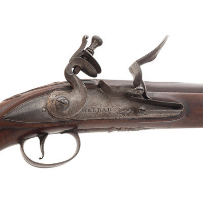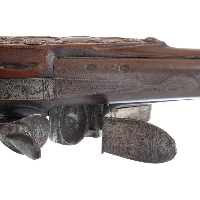 .60 caliber. 12" pinned barrels. NSN. Browned barrels, silver mountings, smooth varnished walnut stocks. Single shot smoothbore flintlock holster pistols with brass blade front sights, no rear sights and wooden ramrods with flat metal faces. 5.25" slightly convex flint locks remain in original flint and are marked BARBAR. Locks with integral rounded, fenced and bridled steel pans, rounded swan neck cocks and faceted frizzes with rounded toes. Tops of barrels marked BARBAR on the nocksform. Breeches with London gunmakers {CROWN/GP} and {CROWN/V} proof and view marks and the */IB maker's mark of James Barbar (Barber). Silver mounted with grotesque mask butt caps, open work side plates, lightly engraved triggerguards with urn finials, thimble and entry pipe and thumb escutcheon, but only the triggerguards show external London silver hallmarks. These include a {Lion passant}, the {King} and a {Gothic B} in a shield date code, indicating the silver was marked in 1757. Stocks with raised carved moldings at the tails of the locks and counterpanes and shell motif aprons around the breech plug tangs. One ramrod includes an integral wiper at the end and the other is threaded for tools. James Barbar was apprenticed to his father, London gunmaker Lewis Barbar in 1714, was free of the Gunmaker's Company with his proof piece passed in 1722, elected Assistant in 1737 and passed as Master in 1737. He was appointed "Gentleman Armorer" to King George II in 1741 and Furbisher at Hampton Court, a post he resigned from in 1767. His premises were on Portugal Street 1726-1767 and Dover Street 1739-1767. James Barbar died in 1773. (Blackmore) {ANTIQUE}