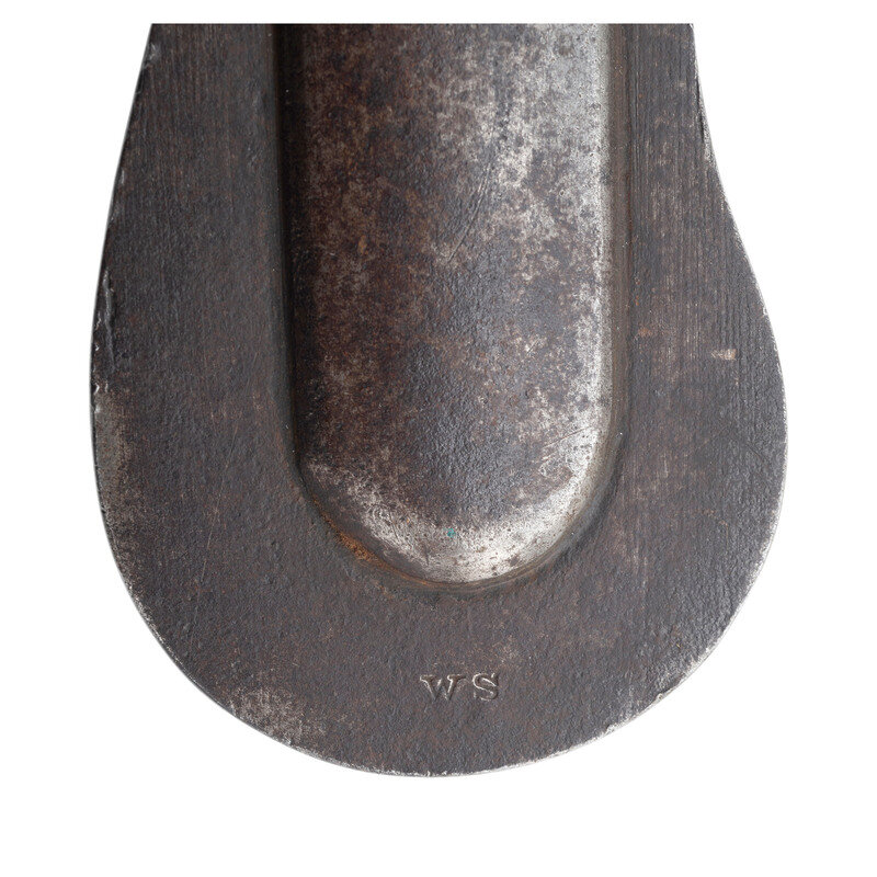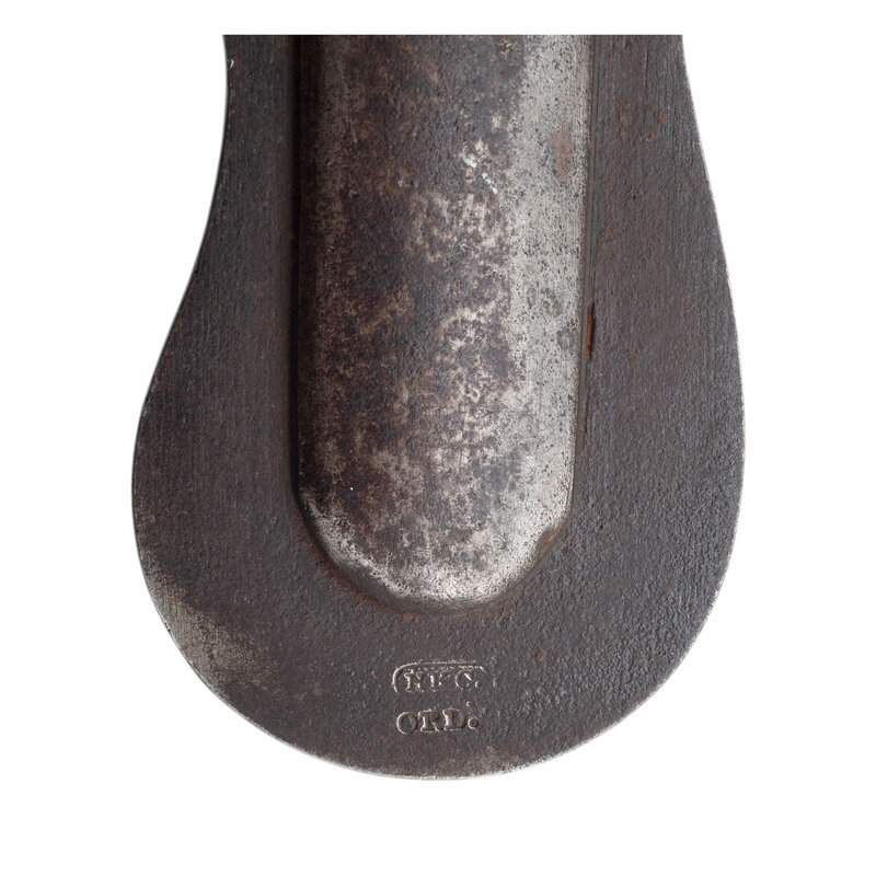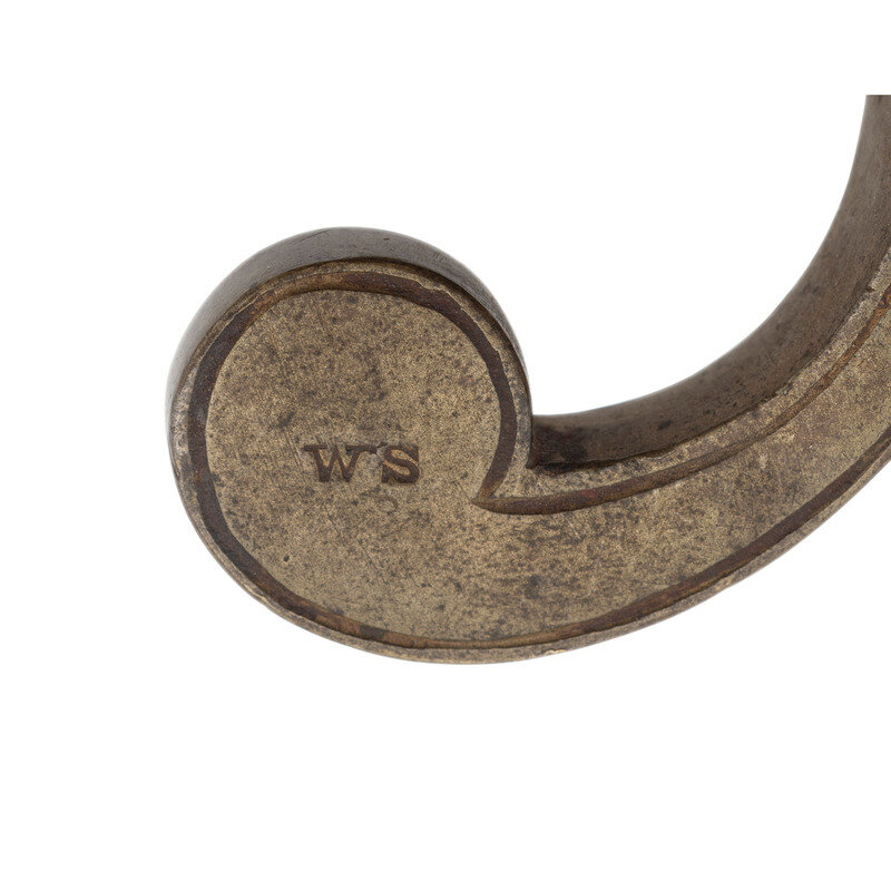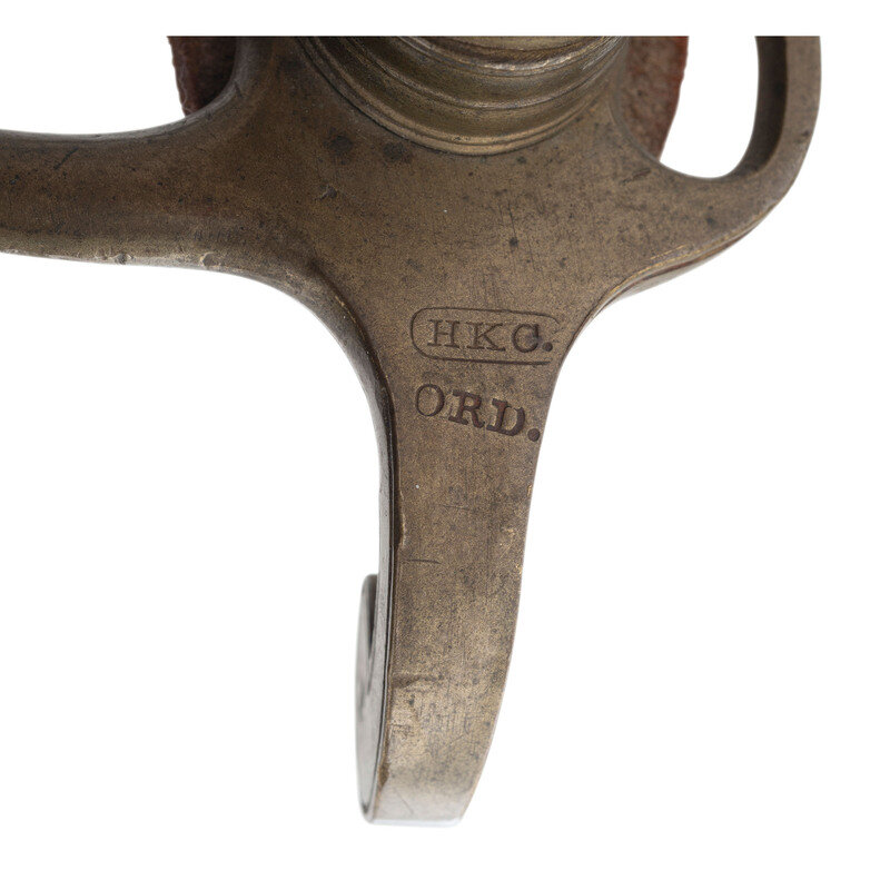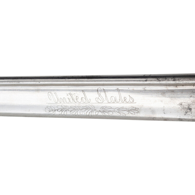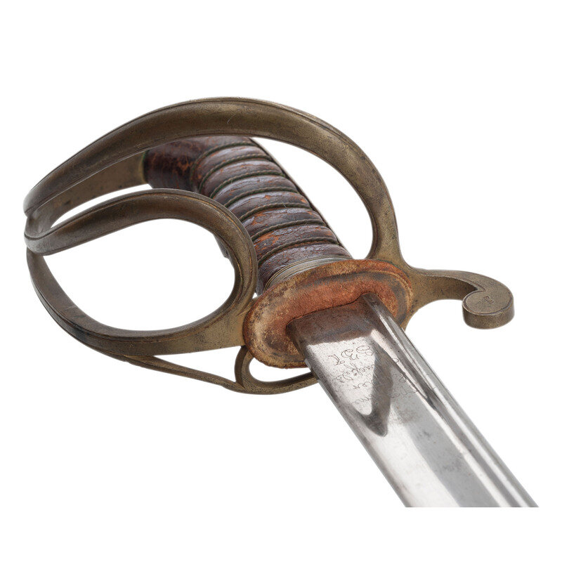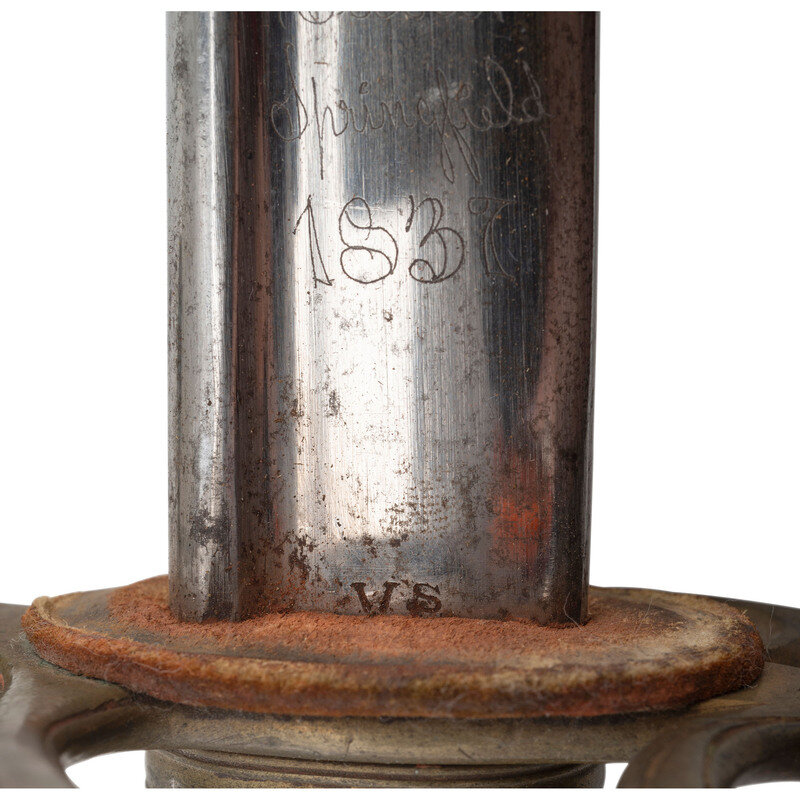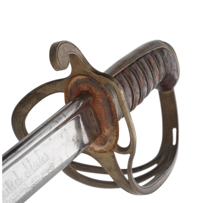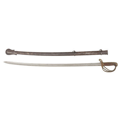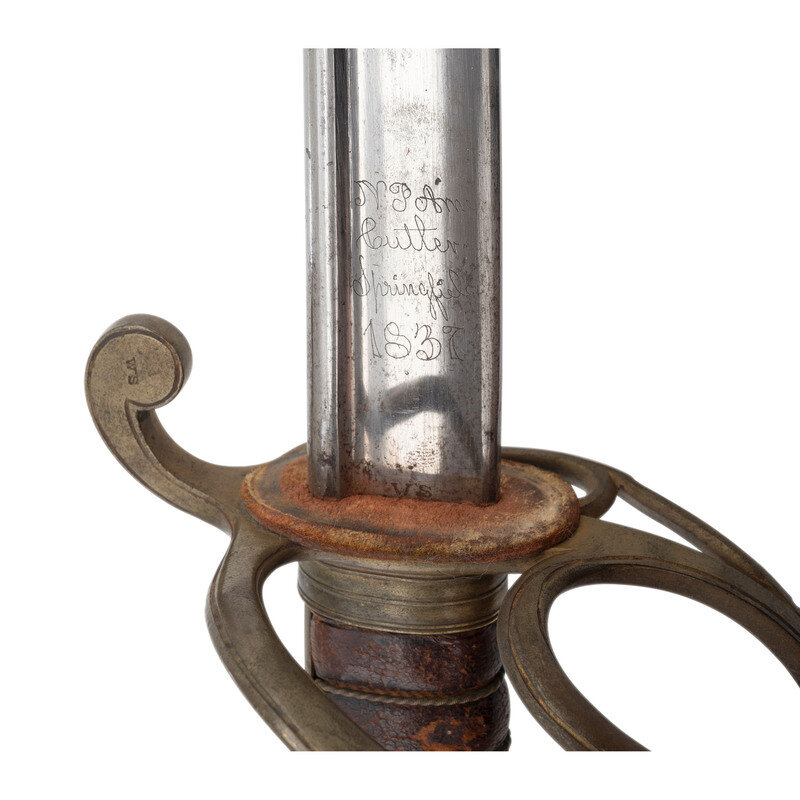 34" single edged, slightly curved spear point quill-back blade with round spine. 39.75" in overall length. 5.25" hilt with cast brass two-branch guard with knuckle bow and backstrap with stepped pommel cap with spanner nut pommel cap. Grooved wood grip with leather covering and seven wraps of multi-strand twisted wire. Thick buff leather throat washer at blade to hilt junction. Reverse of blade dry needle etched United States in script over a floral splay with the obverse similarly etched in four lines: N.P. Ames/Cutler/Springfield/1837. Obverse ricasso stamped with a WS inspection, the mark of Springfield Arsenal civilian sub-inspector William Smith, with a matching WS on the obverse of the quillon. Top inner face of quillon stamped with a small HKC cartouche and ORD for Henry Knox Craig, Ordnance Officer. Browned sheet iron scabbard with screw-attached boat throat and correct split ring hangers is also inspected on the drag with a WS on the obverse and the HKC and ORD on the reverse. A truly fine example of a US Dragoon saber from the pre-Mexican War period.