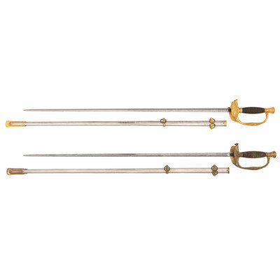 2) 31.5" straight, tapered, diamond cross section spear point blade. 37.5" in overall length. 5.5" hilt with gilt brass clam shell guard and counter guard decorated with patriotic themes, grooved wood grip with leather covering and 16 wraps of twisted wire and urn shaped pommel. Blade etched with marital and patriotic themes a with the legend U.S./ARMORY/Springfield/MASS. Obverse ricasso with C.G.S. inspection initials. Includes a nickel plated steel scabbard with gilt brass mounts.