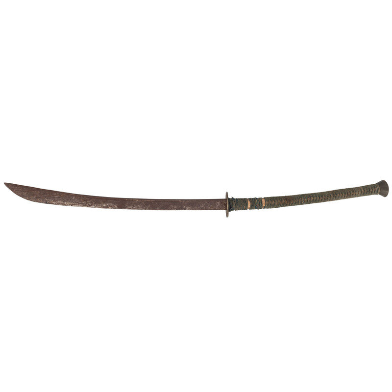 33" blade length. 23.5" hilt. 56.5" overall. Curved single edged sword similar in style to the Chinese Chuanwei Dadao, and featuring a long wood handle wrapped in cord featuring peened tang, brass disc guard, and brass pommel cap. Blade features 17" long fullers along the back of the blade and flares at tip. Left blade struck with four Chinese characters. Geometry of the blade somewhat resembles the Burmese Dha. Exceptionally thick blade is .4375" along the spine forward of the guard. Item weighs approximately 5.4 lbs.