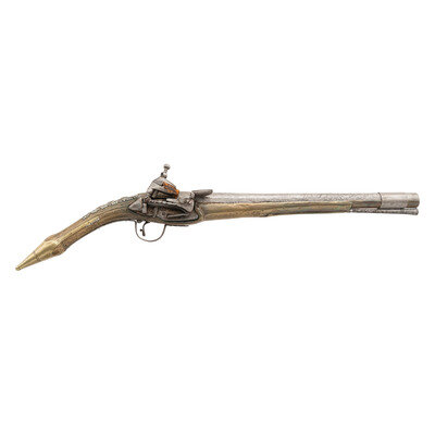 .68 caliber. 12.5" barrel. NSN. Bright barrel, brass frame, all metal furniture. Single shot, muzzleloading miquelet lock smoothbore pistol with faux ramrod and grooved frizzen face. Unmarked. Traditional rat tail miquelet form. {ANTIQUE}