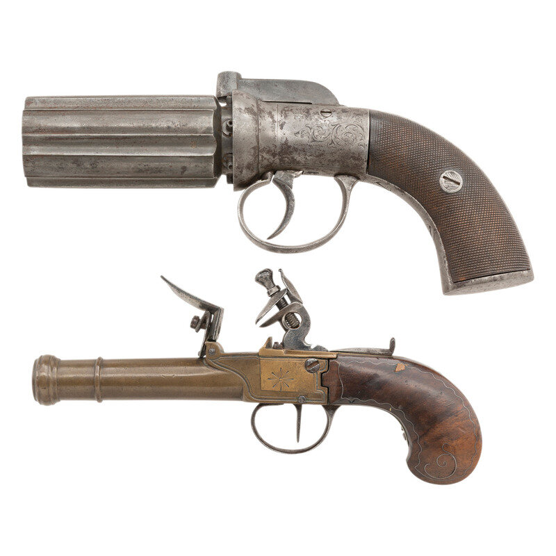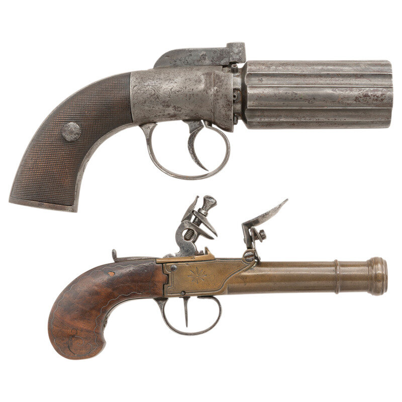 Two Antique Handguns: Brass Flintlock Pocket Pistol and Pepperbox
