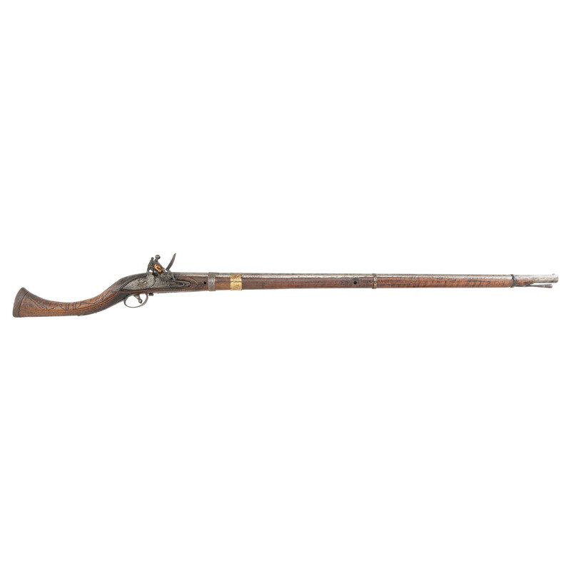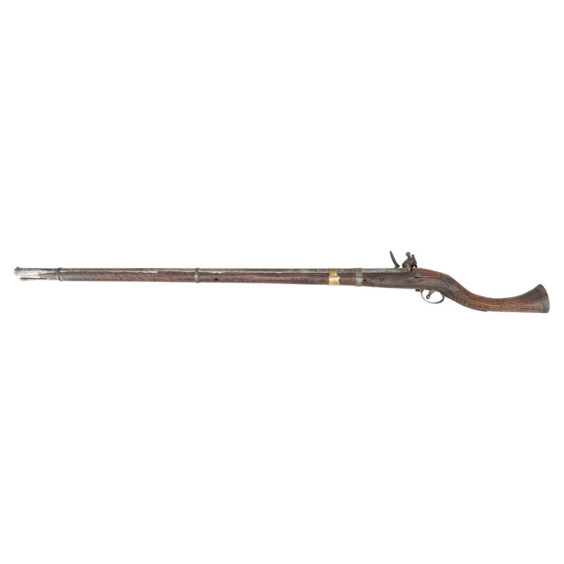 .54 caliber. 43.5" slightly swamped octagonal barrel. NSN. Bright finish, iron mountings, one sheet brass barrel band, local hardwood stock. Single shot muzzleloading flintlock rifle using a recycled East India Company Brown Bess lock, with four barrel bands, traditional Afghan form for the stock and an iron ramrod. Unmarked except for the weak East India Company markings on the lock. {ANTIQUE}