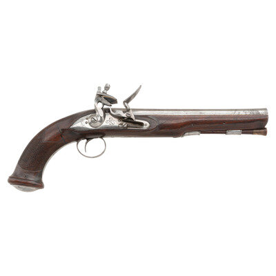 22 Bore (.60 caliber). 9.5" pinned round swamped barrel with top salt. NSN. Bright finish, steel furniture, hardwood stock with checkered grip. Single shot smoothbore muzzleloading flintlock pistol with horn tipped wooden ramrod. Lock remains in original flint and is marked with the East Indian Company's "Rampant Lion" under the pan and with what appears to be an Urdu marking at the tail that provides a name of a potential maker and roughly "made in Lahore", a city in Punjab, which is now part of Pakistan. At the time this pistol was made (probably circa 1830s-1850s), the Punjab region was under control of the Sikh Empire and then in 1849 fell under the control of the East India Company, with the British Raj taking control in 1858. The pistol is made in a French form that was popular with French officers and some British officers as well, who were required to purchase and provide their own sidearms. Likely this was made to be sold to a less wealthy East India Company Officer, possibly in a Sikh regiment. A very nice and crisp pistol that likely dates from the early period of the British Raj and a time when the East India Company had one of the largest standing armies in the world.