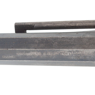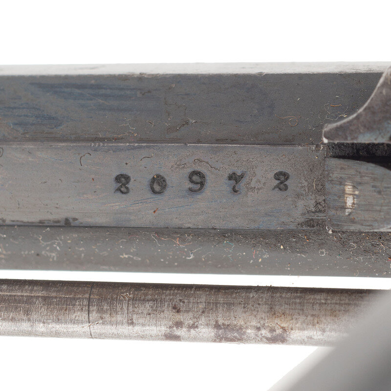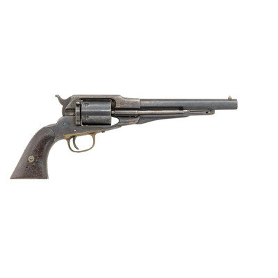 .38CF. 7.5" octagonal barrel. SN: 20973. Blued finish, color casehardened hammer, brass triggerguard, smooth two-piece walnut grips. Single action percussion revolver factory altered to cartridge with an added recoil shield, loading gate and ejector rod system. Topstrap groove rear sight, German silver cone front sight. Weak two-line 1861 date Elliot patent marking and Remington address on barrel. Matching serial numbers under barrel and on lower left of grip frame under grip. Grips with illegible pencil numbering. A relatively scarce Remington factory alteration, much less frequently encountered than those performed on the .44 caliber revolvers. {ANTIQUE}