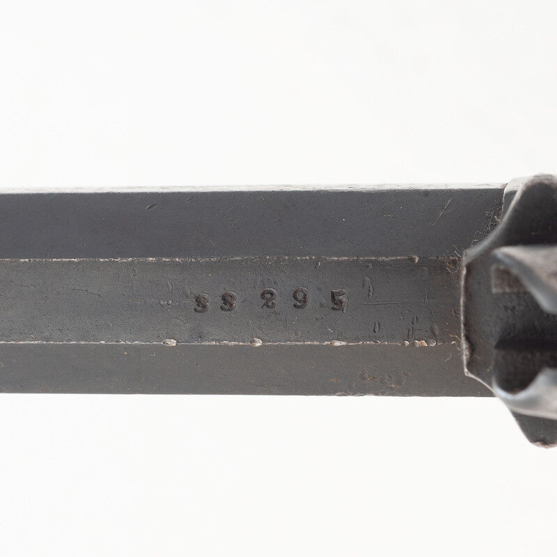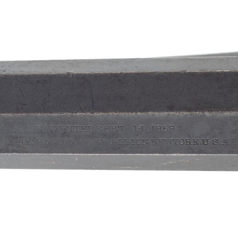 .44CF. 8" octagonal barrel. SN: 33295. Blued finish, color casehardened hammer, brass triggerguard, two-piece smooth walnut grips. Single action US military contract percussion revolver altered to cartridge with an un-fluted six-chambered cylinder, no ejector rod, a grooved topstrap rear sight and a dovetailed German silver pinched blade front sight, likely modified from the original German silver cone sight. Standard Remington two-line, 1858 date barrel markings without the "NEW MODEL" third line. US military sub-inspections throughout on the metal, with a weak, illegible cartouche on the left grip. A classic example of a Civil War used US military percussion revolver altered to cartridge after the Civil War. The work is not quite the quality of Remington factory work and R. Bruce McDowell suggests these conversions were performed by a major retailer (Hartley & Graham perhaps?) in his book A Study of Colt Conversion and Other Percussion Revolvers. An identical specimen to this example is pictured and discussed on pages 64-65 of that book. {ANTIQUE}