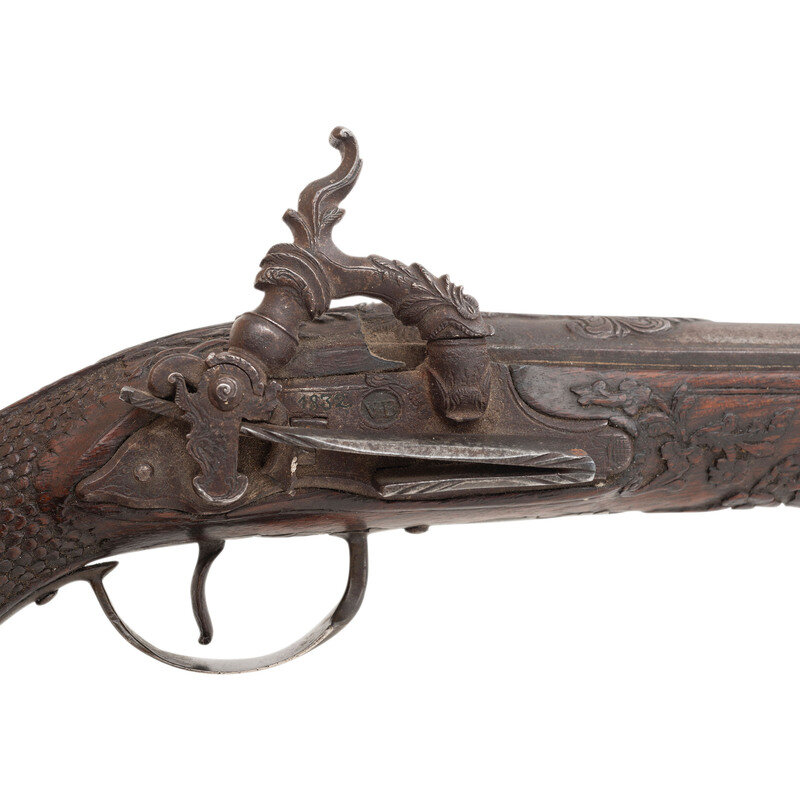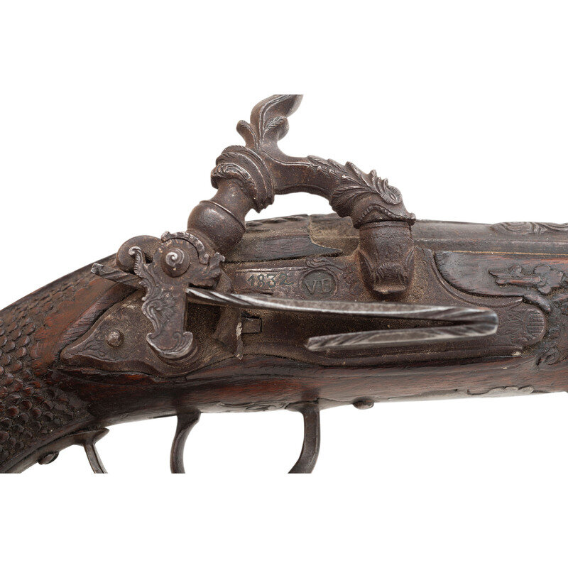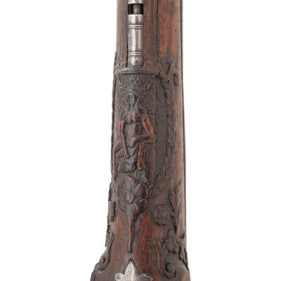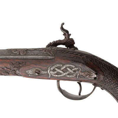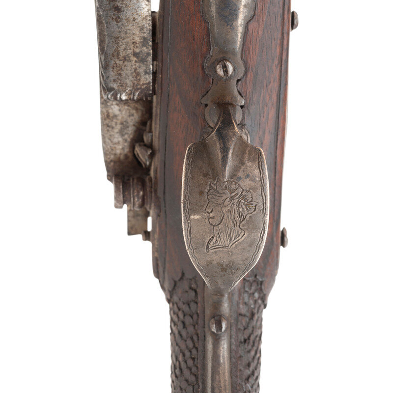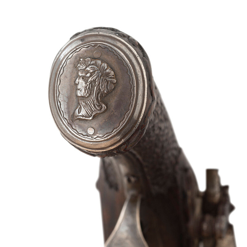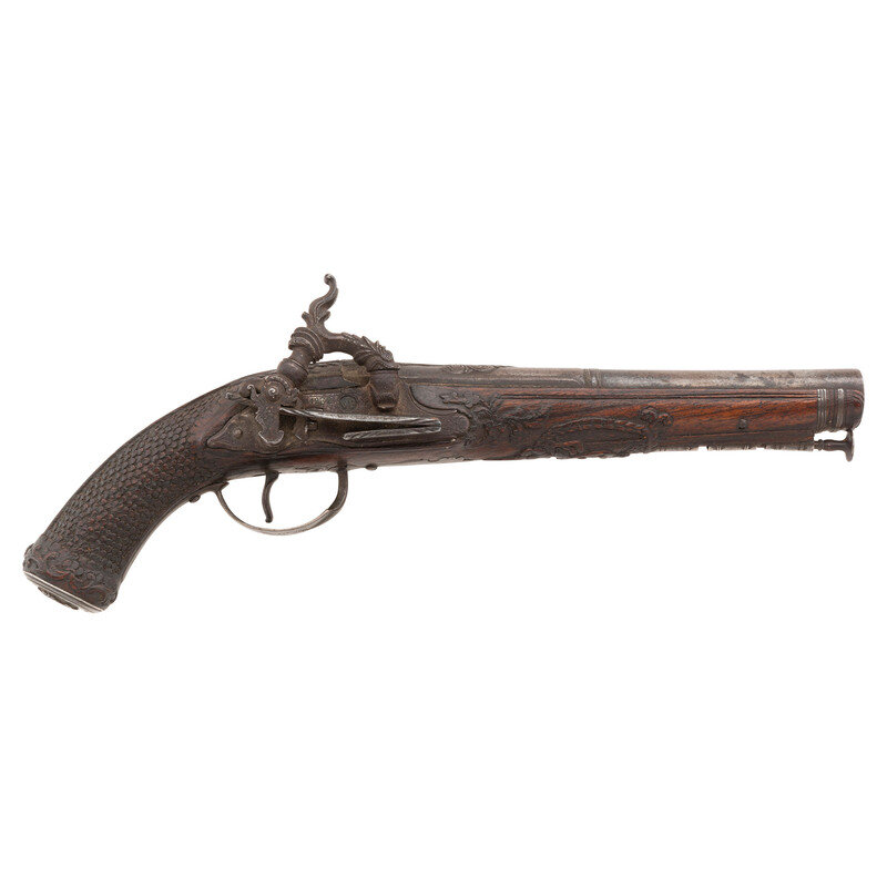.62 caliber. 7.125" two-stage pinned octagon to round slightly swamped barrel. NSN. Blued finish, silver mountings, fine relief carved European hardwood stock. Single shot smooth bore muzzleloading miquelet lock percussion pistol without sights. Lock marked with a raised VD makers mark in a depressed circle and dated 1832 above the mainspring. The pistol is profusely decorated with classical motifs including raised chiseled decorations at the breech that likely represent the Roman god Jupiter, a dolphin or sea serpent themed hammer nose with decorated hammer neck and spur, a raised bust of Caesar or another Roman emperor on the bottom of the silver butt cap and a similar decoration engraved on the bow of the silver triggerguard. The stock features raised carvings with foliate and classical themes on the forend, foliate scrolls down the backstrap and carved fish scale style checkering. Three silver pipes secure a button head steel ramrod. A really exquisite Spanish overcoat sized pistol from the early part of the percussion period. {ANTIQUE}