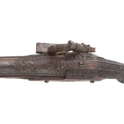 Fine Relief Carved Silver Mounted Spanish Percussion Miquelet Pistol Dated 1832