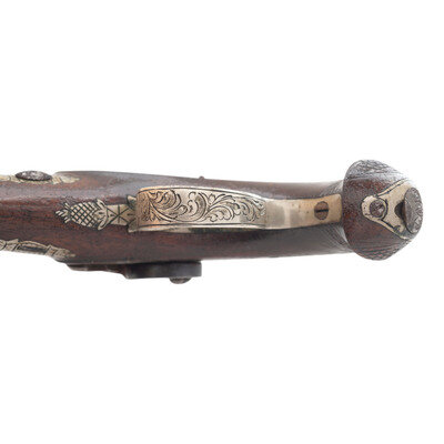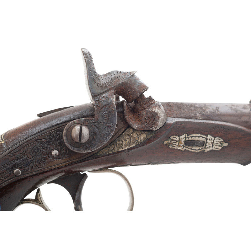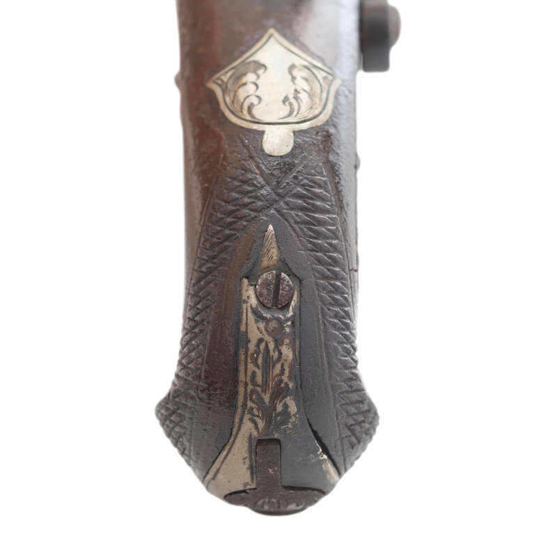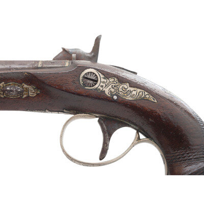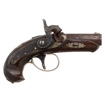 .36 caliber. 2.25" barrel. NSN. Browned finish, color casehardened lock and hammer, German silver mountings, checkered walnut stock with bird's head grip. Single shot percussion muzzleloading pocket pistol with a rifled bore, rudimentary fixed notch rear sight, dovetailed German silver blade front sight and mountings suggesting production circa 1850-1870, nominally 5" in overall length. Engraved back action percussion lock marked DERINGER/PHILADELA with the same stamp applied to the top of the barrel flat at the breech. Breech with Deringer {SUNBURST-P} proof. Engraved German silver mountings, including a shield shaped thumb escutcheon, with a pineapple finial at the front of the triggerguard plate. A hinged cap box is present in butt of the pistol. A lovely little Deringer pistol that has a lot of finish but has suffered from poor storage and might be improved by a careful cleaning. {ANTIQUE}