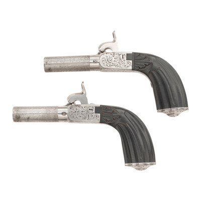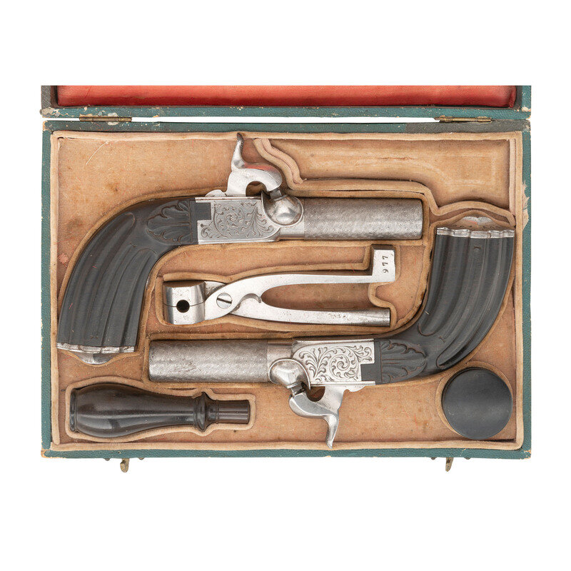 .50 caliber. 1.875" barrels. SN: 977. Bright, faux Damascus patterned barrels, bright engraved frames, fluted ebony grips. Single shot turn off barrel rifled percussion pocket pistols with folding triggers and rudimentary rear sight notches in the rear faces of the bolster recoil shields. Pistols are unmarked other than the number 977 under the breeches, along with Liege proof and controller marks. The pistols are contained in their original green leather covered wooden French fit case with a salmon colored interior. The pistols are cased with their original accessories, including a combination bullet mold, barrel and nipple wrench which is numbered 977, a turned wooden box for caps and a turned wooden powder flask. The casing has gilt embossed decorations on the lid. {ANTIQUE}