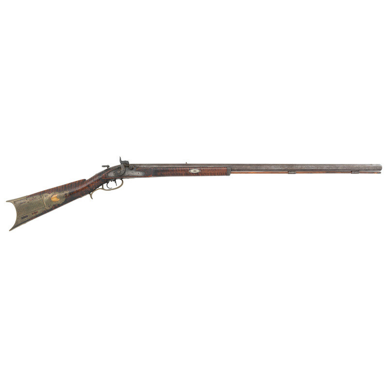 .40 caliber. 33.75" wedge retained octagonal barrel. NSN. No finish, brass furniture, faux striped hardwood stock. Muzzleloading single shot percussion rifle with folding peep sight on tang, fixed notch rear sight in barrel dovetail and front sight blade missing from its dovetail. Leman marked percussion lock, double set triggers. Nicely engraved and decorated brass four-piece eagle head patchbox. Lock needs mechanical attention. Includes a wood ramrod. {ANTIQUE}