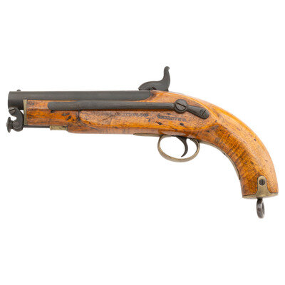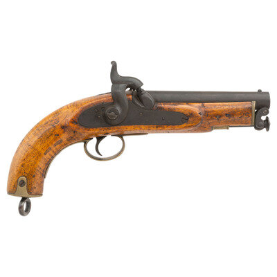 26-Bore (.56 Caliber). 6" pinned barrel. NSN. Bright barrel, color casehardened lock and hammer, brass furniture, walnut stock. Single shot percussion smoothbore muzzle loading pistol with fixed notch rear sight, post front sight, belt hook, swivel ramrod and lanyard ring in butt. Lock marked {CROWN}/VR at tail and 1855/TOWER and with a small {CROWN-BROAD ARROW} forward of the hammer. Counterpane marked by the maker SWINBURNE & SON and also W HAWKINS, probably the stock maker. Barrel Board of Ordnance inspection and proof marks. Numerous Board of Ordnance inspection marks throughout, including on the belt hook, ramrod, in the stock, etc. The last of the percussion single shot pistol to see use with the British Navy, in the post-Crimean War era many of the Colt M1851 Revolvers acquired in the mid-1850s were relegated to naval use, so that the army could be equipped with English revolvers, primarily from Robert and later John Adams. A nice, untouched example.