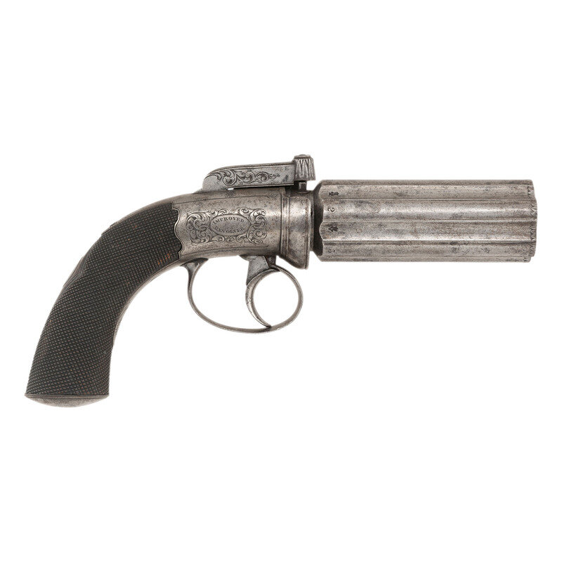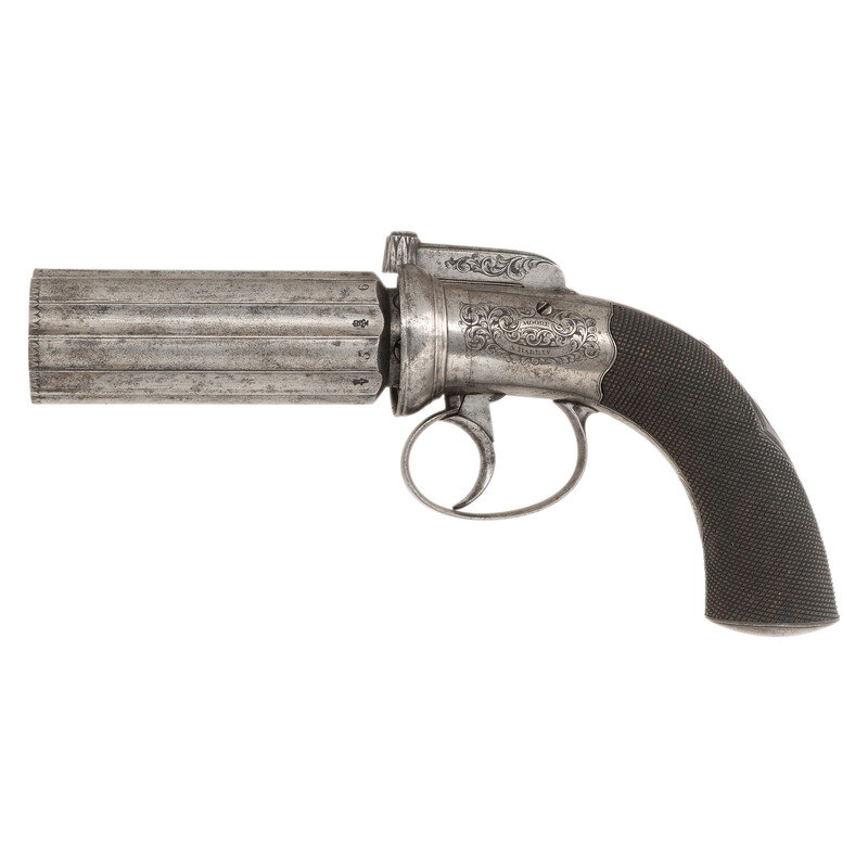 .42 caliber. 4" fluted six barrel cluster. NSN. No finish, checkered walnut grip. Double action only bar hammer English pepperbox with cap box in butt. Frame, bar hammer and triggerguard with tight flowing foliate engraving, marked MOORE & HARRIS on the left side of the frame and IMPROVED REVOLVER on the right side. Barrels numbered 1 though 6 with London commercial proof marks between the barrels in the flutes. Moore & Harris worked as gun & pistol makers, as well as gun barrel and gun lock makers in Birmingham circa 1840-1864. They received English Patent #69 of October 1, 1852, for a "percussion revolver". That patent may apply to this pepperbox. {ANTIQUE}