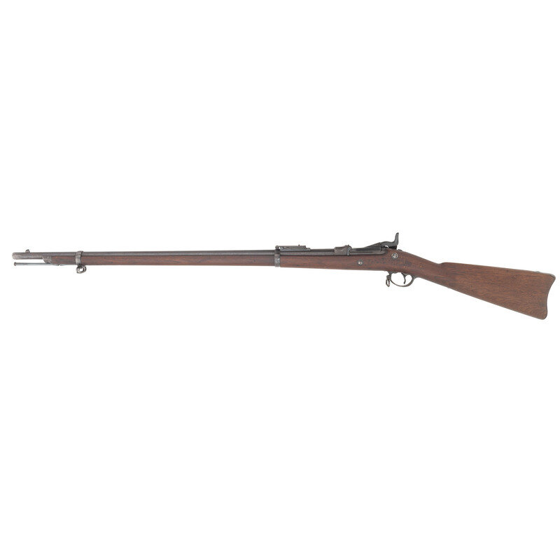 .45-70. 32.375" barrel. SN: 501504 (mfg. ca. 1891). Blued and color casehardened finish, steel furniture, full-length walnut stock. Single shot breechloading military rifle with M1884 Buffington rear sight, Barleycorn front sight, two-piece triggerguard, 3-click tumbler, sling and stacking swivels, slotted head cleaning rod. Standard lock markings for this period of production and 1884 breech block marking. A weak script SWP cartouche with an illegible date is present at the left wrist and a weak {Circle-P} firing proof is still visible behind the triggerguard. {ANTIQUE}