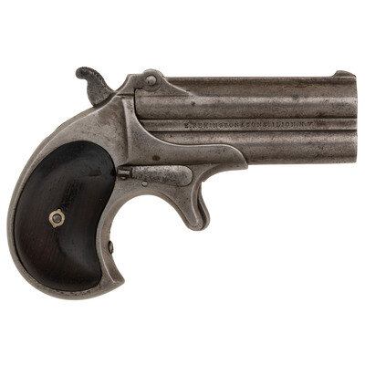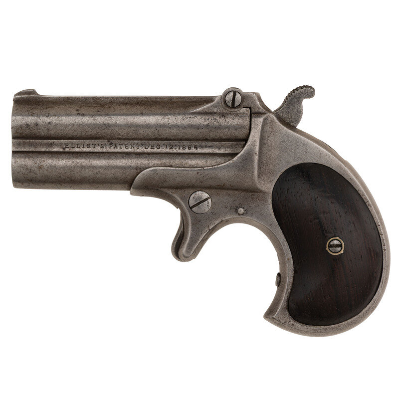 .41RF. 3" barrels. SN: 1278. No finish remaining, smooth rosewood grips. Single action spur trigger, trip up barrels over and under double derringer with pivoting firing pin, hinge notch rear sight and blade front sight. Markings are between the barrel ribs on the sides of the pistol, reading E. REMINGTON & SONS ILION, N.Y. on the obverse and ELLIOT'S PATENT DEC. 12, 1865 on the reverse. Matching serial numbers on left of frame under grip and under barrel. Made without an extractor. A rare example of the earliest of the classic "Double Derringer" variation produced by Remington, with only about 2,000 of these extractor-less, side address guns believed to have been produced circa 1866-67.