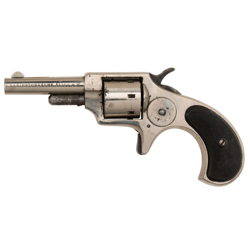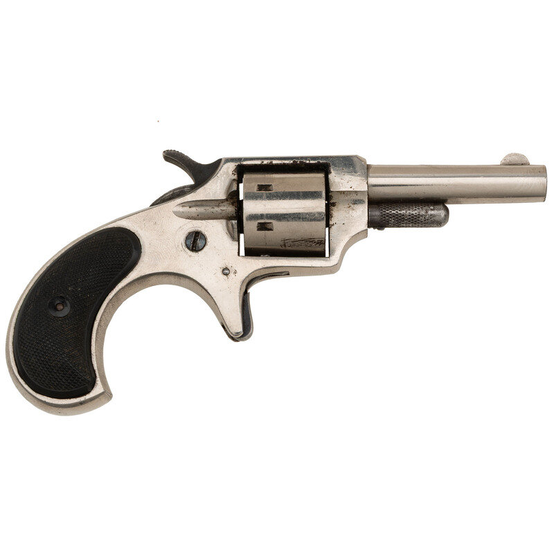 .22RF. 2.25" barrel. NSN. Nickel finish, color case hardened hammer, blued trigger, checkered hard rubber grips. Single action spur trigger solid frame metallic cartridge revolver with seven chambered un-fluted cylinder, top strap groove rear sight, blade front sight. Left side of barrel marked in a single line: E. REMINGTON & SONS. ILION, N.Y. and IROQUOIS on the top. Some 10,000 of these pocket revolvers were produced circa 1878-1888 to compete with the Colt New Line series of handguns and these were one of the guns whose production ended with the Remington bankruptcy and reorganization under the ownership of Hartley & Graham in 1888. {ANTIQUE}
