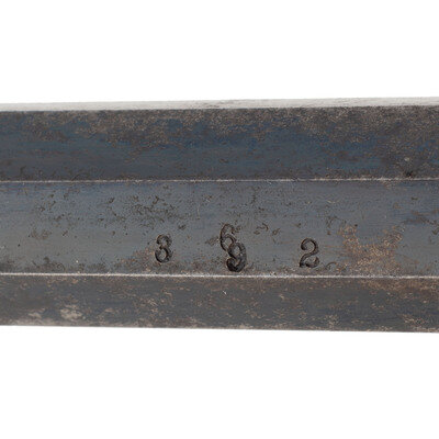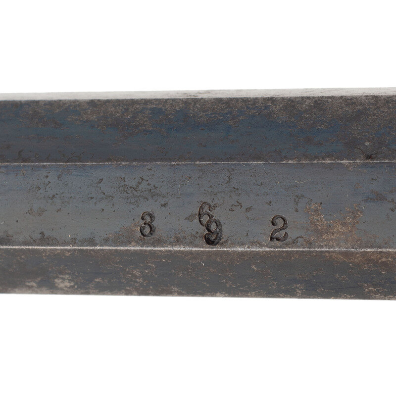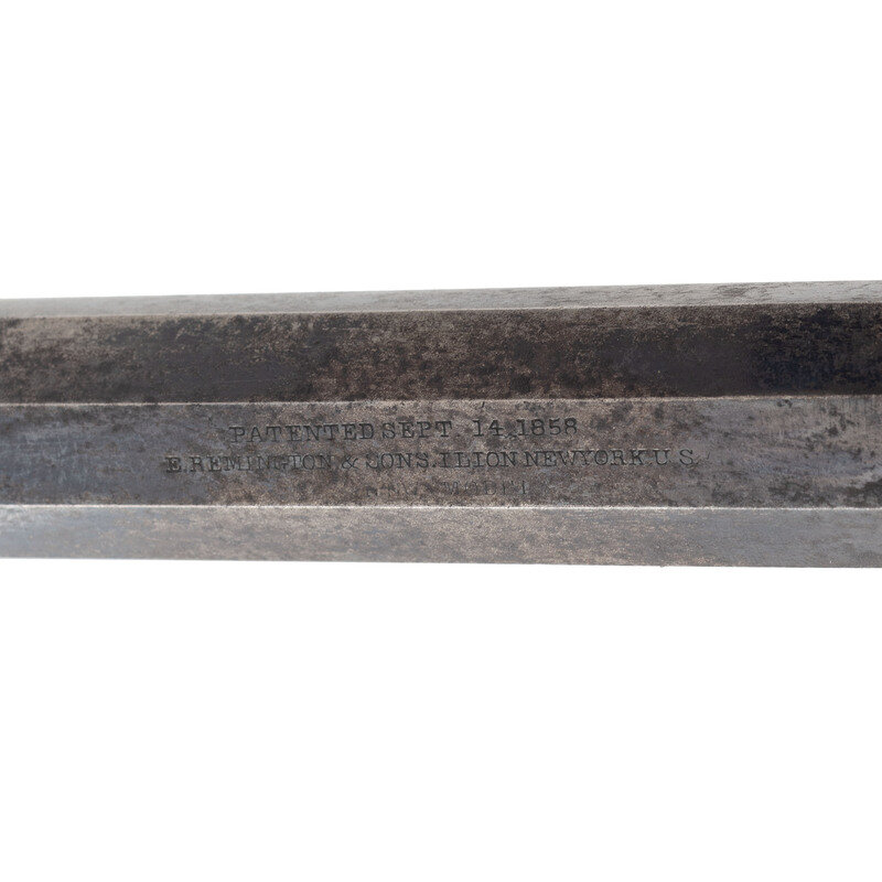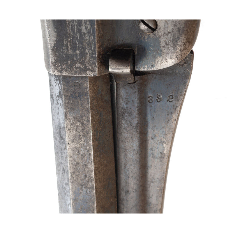 .44CF. 8" octagonal barrel. SN: 141530. Blued finish, color casehardened hammer, brass triggerguard, two-piece smooth walnut grips. Single action factory cartridge conversion of a Remington New Model Army US military contract single action percussion revolver with a cartridge modified six-chambered un-fluted cylinder, dovetailed and screwed factory recoil shield and added and without an ejector rod added. Standard frame notch rear sight and pinched blade front sight. Standard Remington "New Model" barrel markings, with the last line very weak. US military inspection and sub-inzspeciotn marks are found throughout, including script GRC (G.R. Curtis) and OWA (Orville W Ainsworth) cartouches on the grips. The right grip is also stamped with number or alphanumeric mark 08 over the Curtis cartouche. This mark is of the same basic size and style as those found on the "CA" frame marked Remington conversion revolvers. The factory conversion number 392 is stamped under the barrel, on the bottom of the arbor pin "wings", and on the left side of the loading lever web. The grips have illegible pencil markings on their interior. A solid example of what McDowell refers to as a "Smith & Wesson Remington Conversion" without an added factory ejector rod. {ANTIQUE}