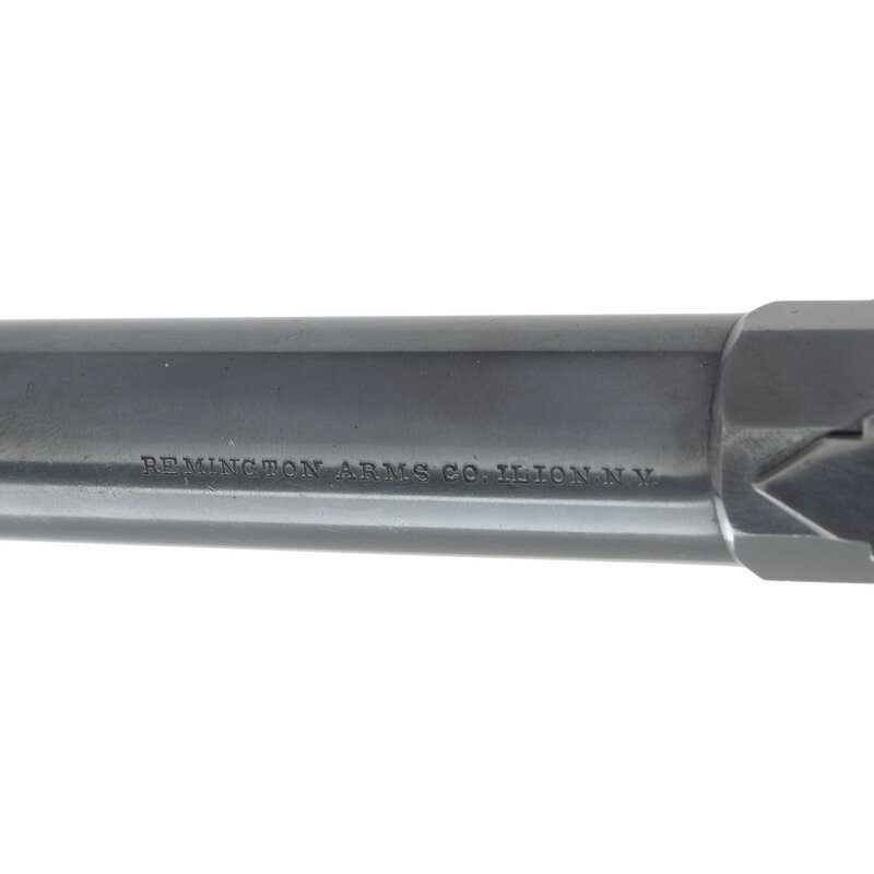 .22RF. 10" octagon to round barrel. NSN. Blued and color casehardened finish, smooth varnished walnut grip and forend. Single shot .22 rimfire alteration of a US M1867 Naval Rolling Block Pistol with added semi-buckhorn elevation adjustable rear sight and dovetailed tall-blade front sight. Barrel with one-line REMINGTON ARMS CO. ILION, N.Y. marking, indicating a post-1888, post-bankruptcy factory barrel. This may be a variant of the Remington Model 1891 or 1901 Rolling Block Target Pistols, which were typically built on over run US M1871 Army Rolling Block Pistol Frames. This is clearly a Navy frame and has the remnant of the P/F.C.W. (Frank C Warner) inspection on the right of the and has no factory markings on the left of the frame. The gun was refinished at the time of alteration. It appears that a very talented gunsmith probably added an original M1891 or M1901 Remington barrel to the M1867 frame and then sleeved it to .22, suggesting the original barrel was .25 or .32. A very attractive Rolling Block pistol variant. As a remanufactured antique frame now chambered for a readily available modern cartridge, ATF classifies this gun as a modern handgun subject to all federal, state and local laws and much be transferred by an FFL holder, rather than as an antique firearm. {MODERN}