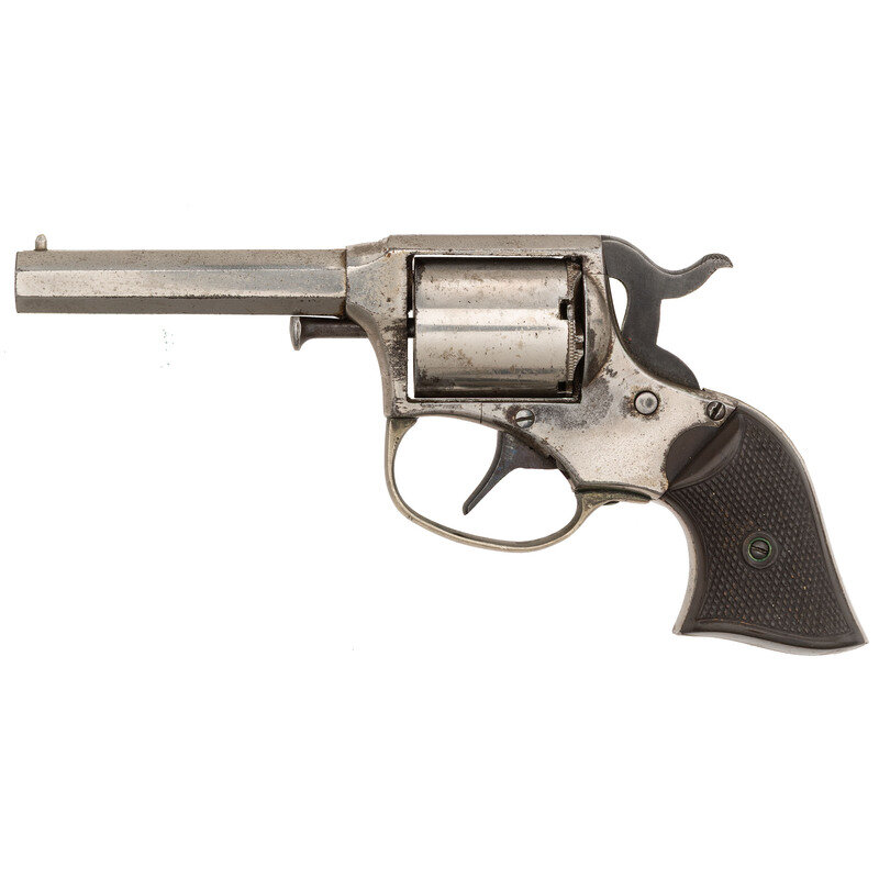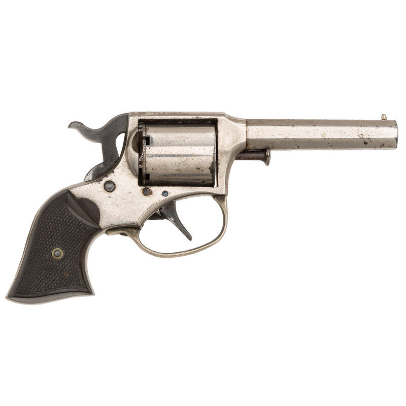 .32RF Short. 3" octagonal barrel. SN: 1364. Nickel finish, blued hammer and trigger, checkered hard rubber grips. Double action cartridge alteration of a percussion pocket revolver with a five-chambered un-fluted cylinder with removable back plate, top strap groove rear sight and German silver cone front sight. Barrel with one-line marking that simply reads REMINGTON'S ILION, NY. Rear of cylinder and backplate with matching assembly number 1327. These numbers do not typically match with the serial number as they are assembly numbers for the two piece cylinder. {ANTIQUE}