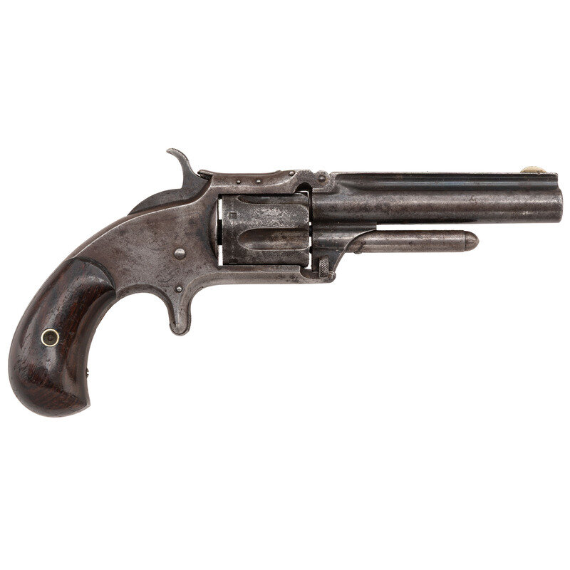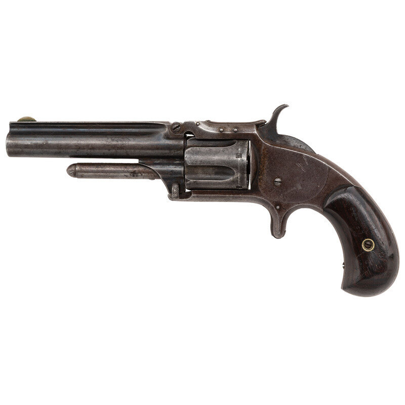 .32RF. 3.5" ribbed round barrel. SN: 32775. Blued finish, color casehardened hammer, smooth two-piece rosewood grips. Single action, spur trigger tip-up barrel revolver with five-chambered fluted cylinder, cylinder stop spring notch rear sight and German silver blade front sight. Standard one-line Smith & Wesson barrel marking for this model, ending with the 1865 patent date. Matching serial numbers stamped on bottom of frame and inside left grip panel. Matching alphanumeric mating numbers CC8 on left of frame under grip, on rear face of barrel web and on face of cylinder. {ANTIQUE}