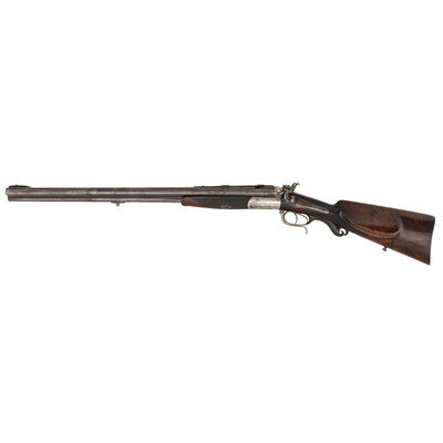 12 Gauge/.44 centerfire. 26.125" barrel length. SN: NSN. 2.625" chamber length. Cylinder chokes. Browned Damascus pattern barrels with buffed bright frame, blued lockplates, and mounting a walnut straight wrist stock with horn finger rest and splinter forend. Side by side Drilling rifle with backlock hammer fired action, the right hammer face pivots down to engage the rifle barrel. No visible maker marks on barrels or locks. Item features a full length matted barrel rib that appears to have been cut and modified to fit a folding notch rear and front bead sights, and a two-piece claw mount scope base. Frame shows a {Crown/V} firing proof mark to the standing breech, while the rifle barrel is further marked with a {Crown/GP}, {Crown/M}, and a {Rampant Lion} proof marking. Aforementioned marks do not quite match the patterns of the London Proof house, suggesting they may have been faked. Frame has no serial number, but the barrels are numbered 14363. Item is missing the wedge pin, leaving the forend loose. Firing pin for right barrel is missing. Comes in a modern production green velvet lined and canvas wrapped case with leather corners and brass combination lockplate. Included in the case are two Unertl style scope rings that lack the claw mounts to fit the barrel, a WOLLENSAK 4 POWER scope, five 12 Gauge brass shells, and an unsigned nickel plated oiler. {ANTIQUE}