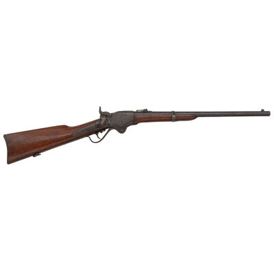 .56-60 (.50RF Government). 22" barrel. SN: 47010. Blued and color casehardened finish, walnut stock and forend. Lever action, manually cocked, tubular butt magazine repeating carbine with folding military ladder rear sight, barleycorn front sight with brass blade insert, saddle bar and sling ring opposite the lock and sling swivel in toe of stock. Three line Spencer markings on top of receiver are weak due to the arsenal refinish. Matching serial numbers are present on the receiver tang and under the barrel. A clear script ESA in an oval cartouche is present on the reverse wrist behind the sling bar. A good example of a Civil War era Spencer carbine refurbished for Indian Wars service, with the addition of the Stabler magazine cut off, but retaining the original six-groove barrel rifling as apparently this gun did not need the three groove sleeve to be added when it was rebuilt. Retains the original Civil War era magazine follower tube as well. While this carbine was not listed in the Springfield Research Service serial number books, two guns close to it were. #46992 was issued to H company of the 6th NY Cavalry in 1865 and #47225 was issued to E company 19th NY Cavalry. No numbers were closer than these two to this gun. {ANTIQUE}