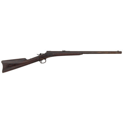 .32 Rimfire. 26" barrel length. SN: 9236. Blued metal finish with casehardened frame mounting a walnut straight wrist stock with splinter forend featuring a steel tip. Single shot octagonal barrel rolling block rifle mounting semi-buckhorn rear notch and front blade sights. Single line address mark to the upper barrel flat reads E. REMINGTON & SONS. ILION. N.Y. Serial numbers match on the barrel and tang. {ANTIQUE}