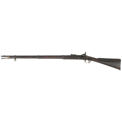 .577 Snider. 36" barrel. NSN. Heavily oxidized metal, brass furniture, hardwood stock. Single shot breechloading metallic cartridge crudely made copy of a British Snider rifle. Includes adjustable ladder rear sight, barleycorn front sight, three solid Type II Enfield style spring retained barrel bands, sling swivels. Crudely made in Nepal or the Middle East.