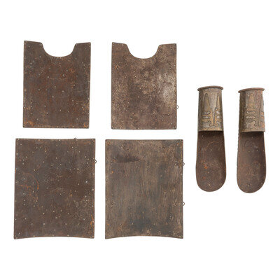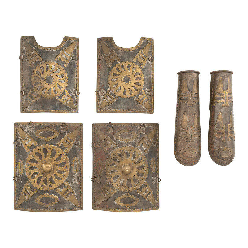 Breastplate and backplate 11.75" x 9.25". Sideplates 10.375" x 7.8". Bazu Bands 12.5" x 3" (diameter at cuff). Set of four piece Indian Char Aina armor composed of hammered steel with riveted brass decorative overlays and triangular fasteners. The faces of the backplate and breastplate are identical, and feature round brass bosses to the center surrounded by a sunburst with stylized katars to the corners. Sideplates are similarly decorated without a central boss. The same katar motif recurs on the bazu bands, which are fastened with lengths of wire through their hinges. Item lacks cords.