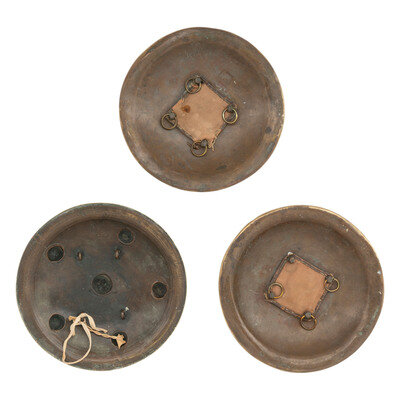 2.-3.) 9" x 9". Stamped and decorated Dahl Bucklers with outward rolled edges and mounting four bosses securing the interior tie-down loops. Both shields decorated with overlapping floral and wheat chaff designs in polished brass with green and red enameled grounds. Both shields retain their pads, but one is missing a tie down loop.