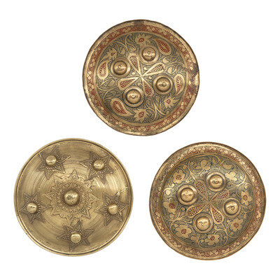 1.) 9" x 9". Cast Sumatran Minangkabau Achnese Shield. Polished brass finish to the face of cast brass buckler with four tie-down loops to the interior. Face of the shield decorated with a central boss surrounded by an eight-point star with geometric patterns surrounded by five bosses over six-point stars.