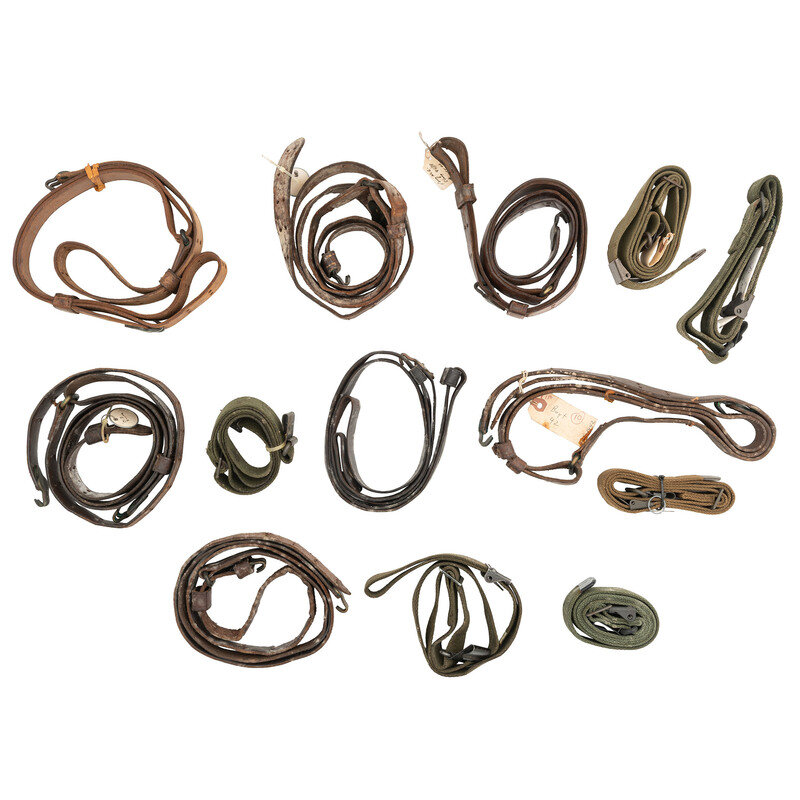 Mixed lot of slings including seven leather slings ranging from Model 1887 to Pattern 1907 and six canvas Nobuckl pattern slings.