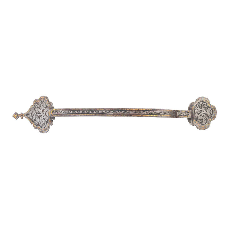 Slightly oval cross section, nominally 8"x8.5"x4" helmet with 2.25" spike on top, two plume mounts on the front of the helm and mount for a nose guard that is no longer present. Bright steel with gold damascene decorations around the rim and on top. Red padded fabric interior lining. Includes an unrelated but loose nose protector.