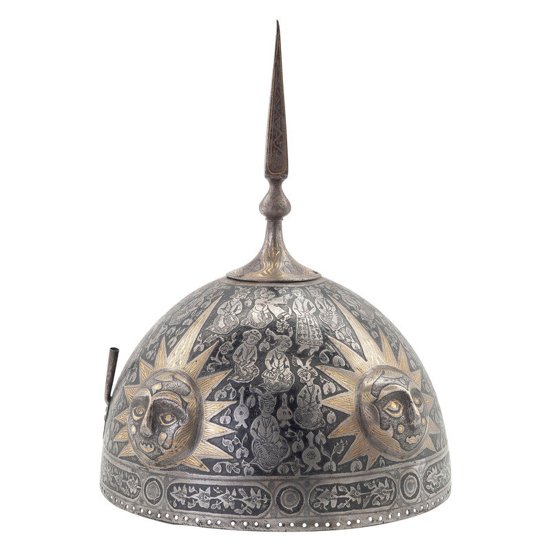 Nominally 8" diameter round helmet, approximately 5" tall with a 5.5" spike on top. Two plume mounts on front, nose guard missing. Chainmail aventail missing as well. Highly decorated with chiseled scenes of spirituality and four large embossed sun faces, possibly representing Surya with gold damascene highlights. No lining present.