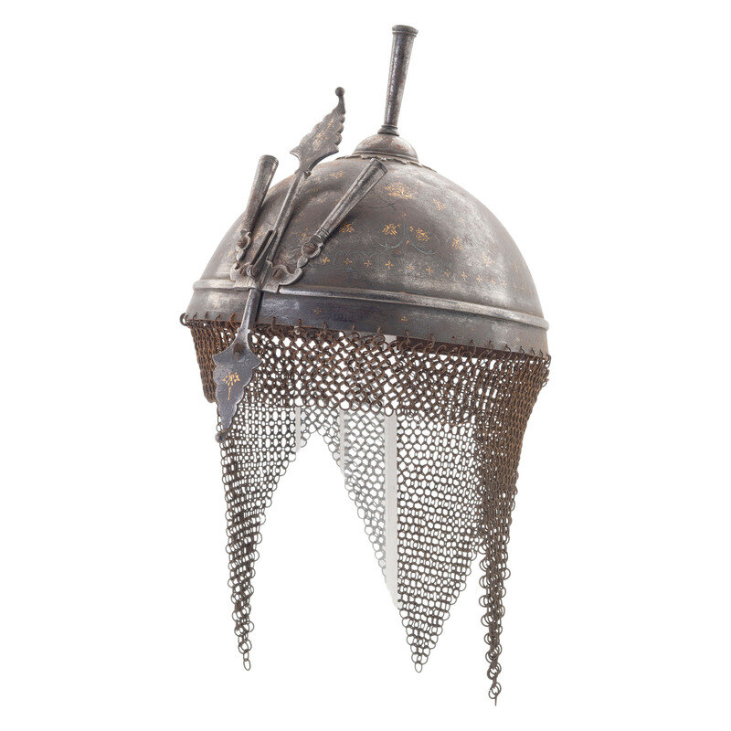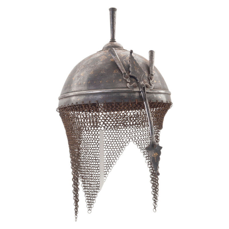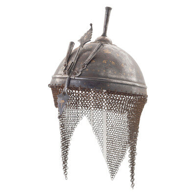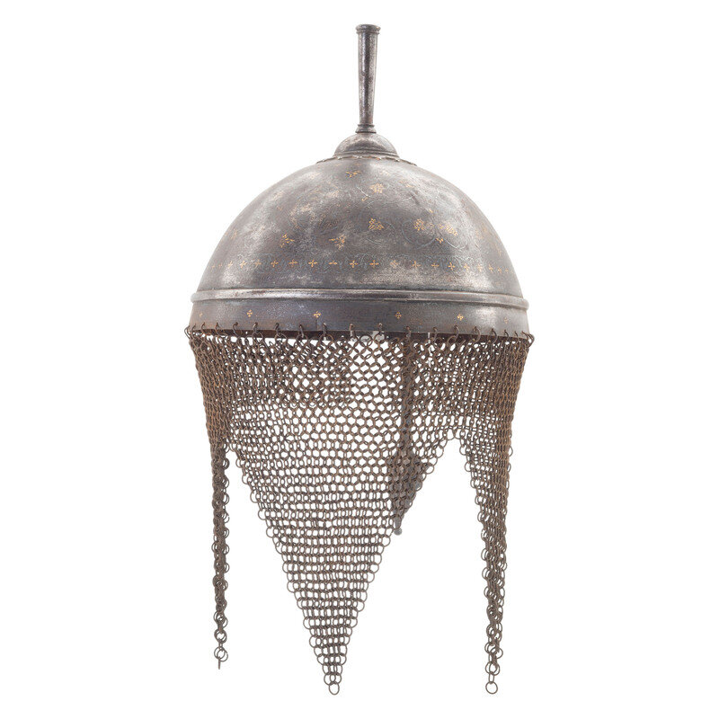 Decorated Spiked Indo Persian Kulah Khud Helmet with Chainmail Aventail and Nose Guard