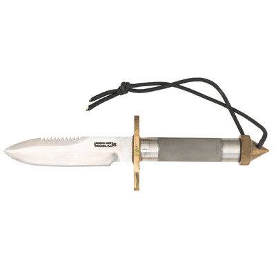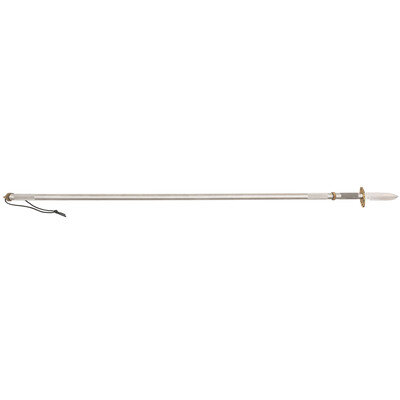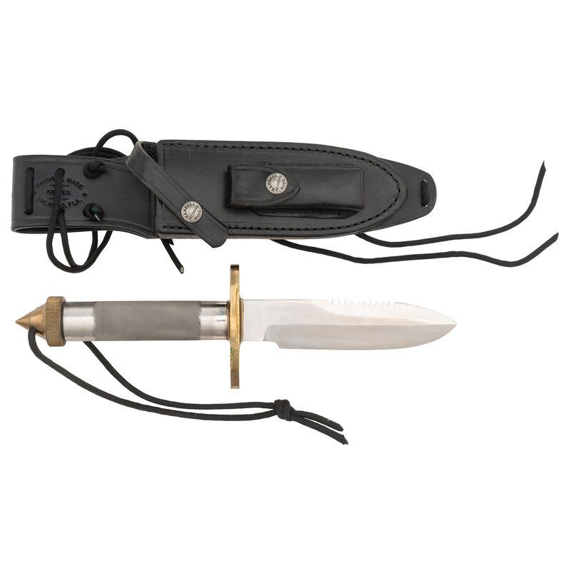 5.5" blade length. 13" overall with sheath and crutch tip pommel to hilt. 61" with sheath and spear handle. Straight single edged spearpoint blade with serrated false edge mounting hollow tube knurled hilt with brass guard. Item struck with maker marking RANDALL MADE/ORLANDO FL followed by S for stainless steel. Item includes a RANDALL MADE marked sheath with sharpening stone, hollow spear handle, pointed brass pommel cap with compass, crutch tip, and flat pommel cap with compass. With the preponderance of components, the end-user is free to reconfigure this piece as a walking stick and knife, or as a survival spear.