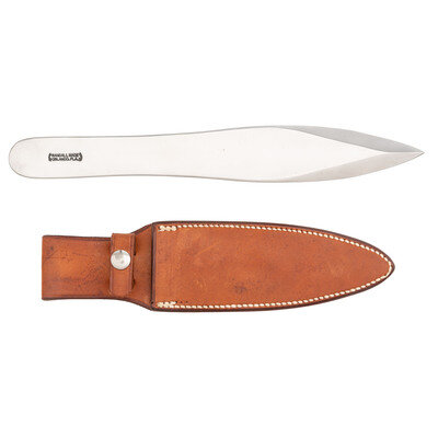 3.5" blade length. 11.25" with blade and hilt. 11.5" overall with scabbard and hilt. Straight double edged spearpoint throwing knife with polished blade, full tang construction, and no grip scales. Tang is struck with maker marking RANDALL MADE/ORLANDO. FLA. between {Swords}. Item comes with a leather sheath with the loop struck RANDALL MADE/KNIVES/ORLANDO, FLA. with model marking 9 11.