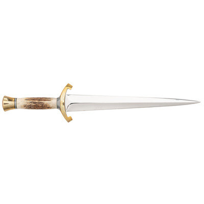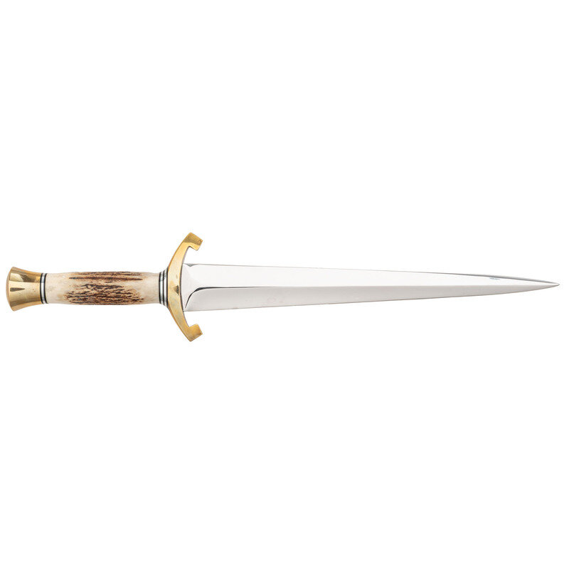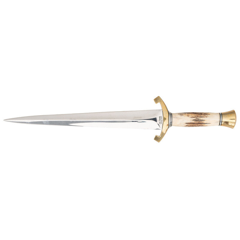 11.75" blade length. 17" overall with hilt. Straight double edged needle point dagger in the style of an Arkansas Toothpick featuring hidden tang construction, a brass guard and pommel, and bone handle enclosed by aluminum and black synthetic spacers. Ricasso is signed DRAPER/Ephraim, Utah. Knife features a medial ridge running 11" along the blade.