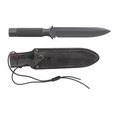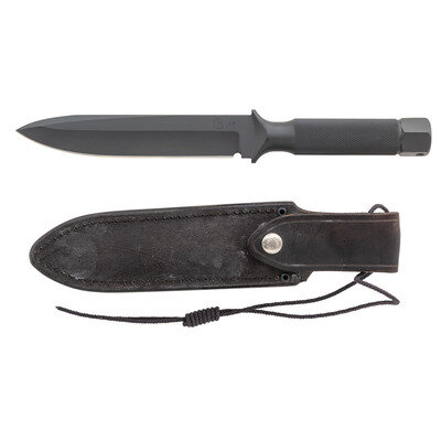 6.875" blade length. 5.125" hilt. 12.5" overall with scabbard. Straight single-edge drop point hollow-handle knife with knurled handle and hex nut screw pommel with lanyard loop port. Left blade struck with the CR monogram of knifemaker Chris Reeve followed by serial number 47. Right blade marked MADE IN SOUTH AFRICA. Hilt void of tools but retains rubber gasket. Comes with CR monogram marked black leather sheath with nylon tie down.