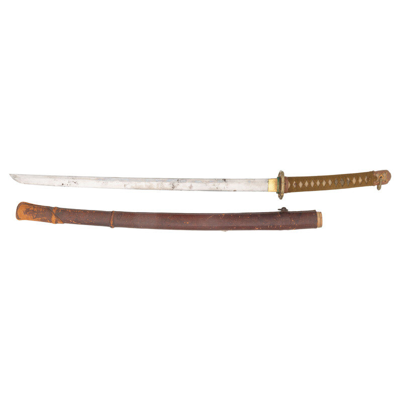 24.75" nagasa (blade length). 39.75" overall with tsuka (hilt) and saya (scabbard). Shinogi-Zukuri style blade with Chu (medium) kissaki and Choji (clover tree) pattern hamon set in standard Type 98 Shin-Gunto mounts. Tip shows a prominent Omaru boshi, the blade overall has an Ihori Mune, and the Masame Hada. Mounts consist of the standard brass tsuba (guard) with four Sakura to each corner over a nanako ground. Hilt shows standard wartime brown grip tape over white rayskin and containing two sakura menuki. Scabbard has a wood core and leather liner, and a brass stud on the outer face that formerly connected to a leather snap behind the tsuba, this flap has torn off. The kiri nakago (flat tip tang) is unsigned and has two mekugi pin ports, suggesting it may be an older hand-made blade transferred into modern mountings.