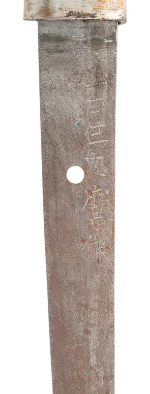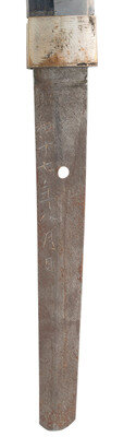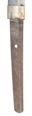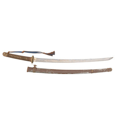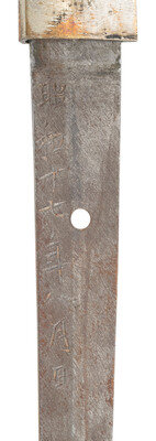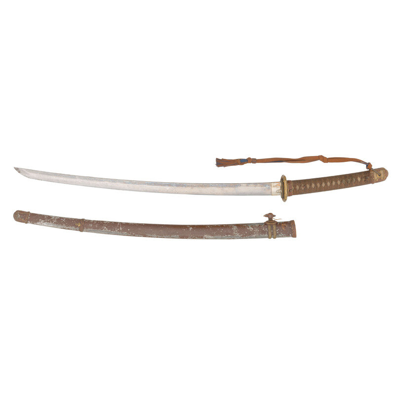 27.75" nagasa (blade length). 40.25" overall with tsuka (hilt) and saya (scabbard). Shinogi zukuri style blade with O-kissaki and Ihori mune set in Type 98 Shin Gunto mounts with painted metal wood core saya. Blade displays midare (irregular) hamon line and masame hada (straight grain). Mounts include a spring catch to the tsuba that locks into the scabbard with the standard brown grip tape over white rayskin. Tsuba decorated with four sakura (cherry blossoms) to the corners over a nanako ground, and similar sakura patterns to all further mountings except habaki. Menuki installed on the tsuka likewise feature cherry blossoms. Imperial Japanese Army brown and blue sword knot is attached to the loop. Both sides of the haagari nakago are signed, but this part appears to have been professionally cleaned at some point with all kanji having some minor residues and no visible rust. Blade shows polishing marks at the tip and intermittently over blade. Mekugi pin fails to fully seat and must be reshaped.