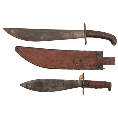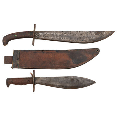 1) 1910 Bolo by Springfield Arsenal, with Scabbard: 13.5" single edged bolo blade, 5.5" hilt, 19.25" overall. Wood grips with brass rivets, steel cross guard. Obverse ricasso marked U.S./8297 and reverse ricasso marked S.A./{Flaming Bomb}/1910. With brass mounted leather scabbard marked LADEW/1918/P.F.G. on the reverse.