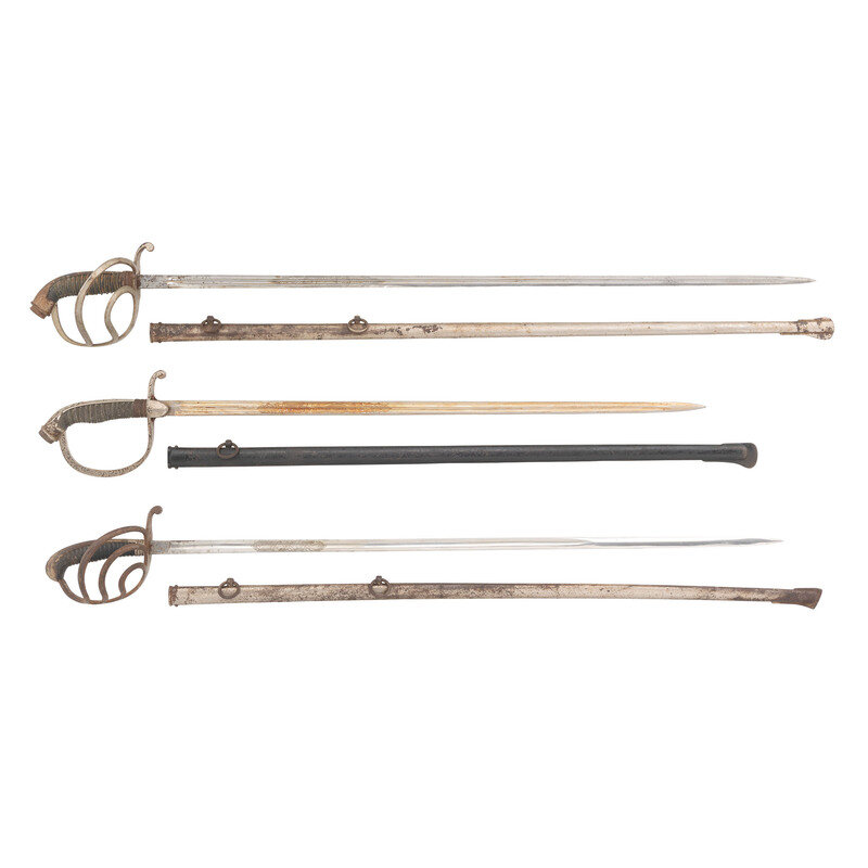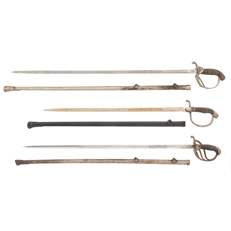 1.) 34.75" blade length. 41" overall with scabbard and hilt. Straight single edged double fullered spearpoint blade mounting nickel plated hilt and guard with shagreen and wire wrapped handle. Item shows the {Kirschbaum} Knight's Helmet logo to right ricasso with the maker mark LORENZ STANKO MUNCHEN etched onto the back of the blade. Item is etched with a crown surrounded by floral motifs. Guard is engraved v. Hallera/v. Schrattenberg/v. Betz. Comes with nickel plated scabbard.