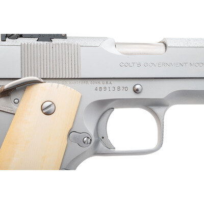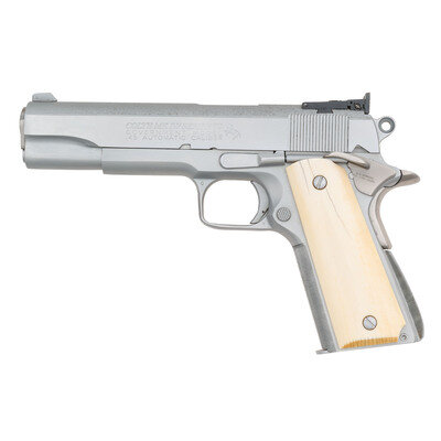 .45 ACP. 5" barrel length. SN: 48913B70 (mfg. ca. 1980). Hard chromed finish overall with polished barrel mounting smooth ivory grips and displaying custom features typical of Armand Swenson's work. Short-recoil operated single action autoloading pistol fed by detachable single stack magazines. Original make and model markings include single-line Colt address to right frame and COLT'S GOVERNMENT MODEL to right slide. Left slide struck COLT'S MK IV/SERIES '70/GOVERNMENT MODEL/.45 AUTOMATIC CALIBER followed by {Rampant Colt} logo. Interior of slide is double stamped A.D. SWENSON. Safety lever is struck A.D. SWENSON/FALLBROOK. CALIF. Custom features include: matted upper slide with engraved edges in Swenson pattern, adjustable BO-MAR rear notch and matted front ramp sights, Commander hammer, Hoag style grip safety, ambidexterous and extended safety lever, recontoured triggerguard with checkered front, fine checkering to forward gripstrap, recontoured and narrowed arched mainspring housing with custom checkering, beveled magazine well, BAR STO barrel, recontoured and hand checkered adjustable trigger, custom fitted barrel bushing, and standard GI style springs. {MODERN}
