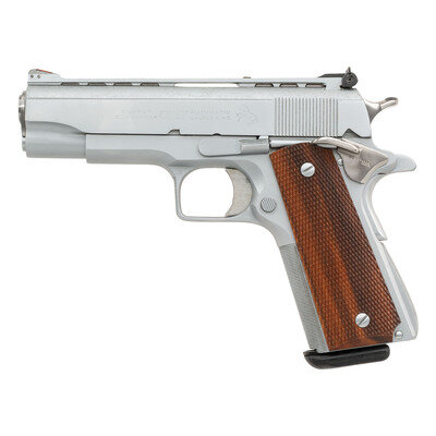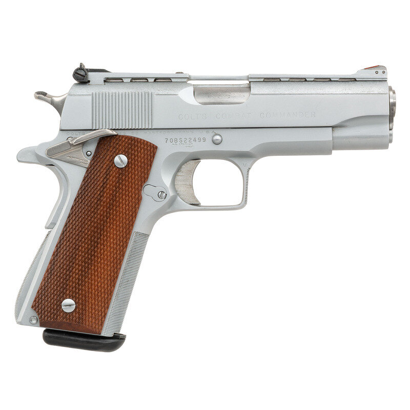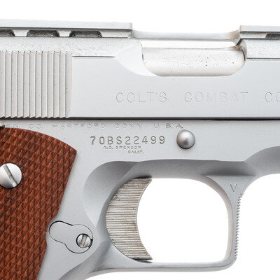 .45 ACP. 4.25" barrel length. SN: 70BS22499 (mfg. ca. 1974). Hard chrome plated finish overall mounting checkered walnut grips customized by Armand Swenson. Short recoil operated single action autoloading pistol fed by detachable single stack magazines. Right frame and both sides of the ambidexterous safety are struck A.D. SWENSON/CALIF. Shows standard Colt manufacturer markings on the slide and single line address to right frame. Custom features include: full length vented rib to slide mounting white outline Smith & Wesson rear notch and pinned red plastic insert front ramp sights, stippled upper slide with engraved borders, matted rear slide, checkering to forward gripstrap and arched mainspring housing, squared off and checkered triggerguard, beveled magazine well, custom fitted bushing, and a custom serrated adjustable trigger. {MODERN}