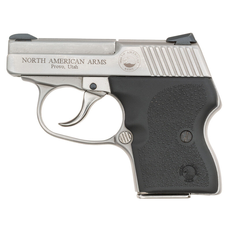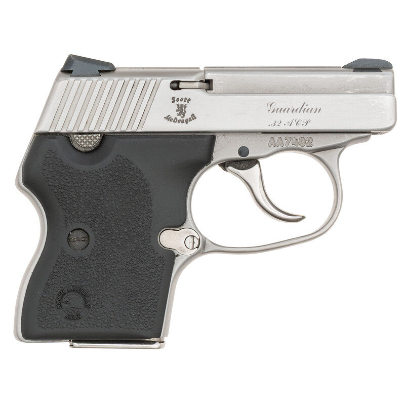 .32 ACP. 2.19" barrel length. SN: AA7402. Matte stainless steel finish overall mounting pebble texture black synthetic grips with North American Arms logos, and Novak style sights. Simple blowback operated DAO autoloading pistol fed by detachable single stack magazines. All edges have been custom rounded by Scott, McDougall and Associates, with their marking to right slide. Standard make and model markings elsewhere. Trigger is polished. {MODERN}