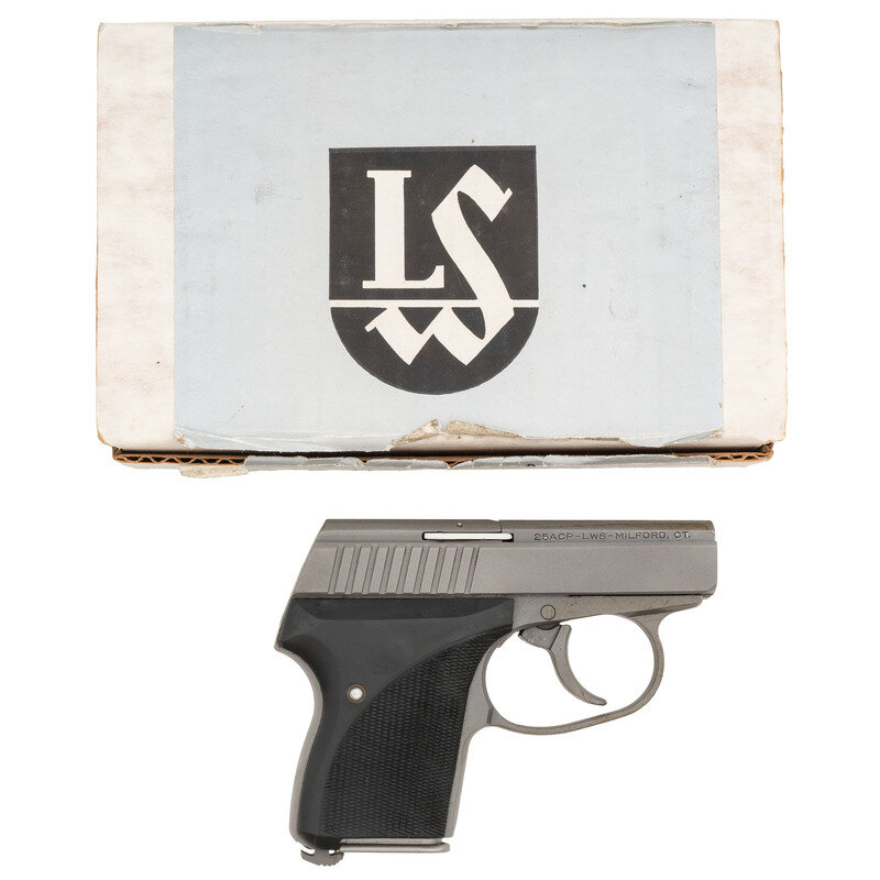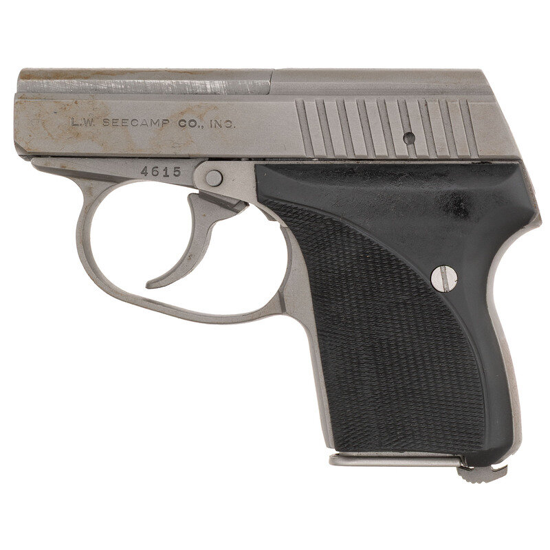 .25 ACP. 2" barrel length. SN: 4615. Matte stainless steel finish overall mounting checkered black synthetic grips with no iron sights. Simple blowback operated DAO autoloading pistol fed by detachable single stack magazines and featuring a magazine safety mechanism. Left slide is struck L.W. SEECAMP CO., INC. with right barrel marked 25ACP-LWS-MILFORD, CT. Item comes in original cardboard box with the owner's manual, warranty card, and spare magazine. This pistol is consecutively serial numbered with the preceding lot. {MODERN}