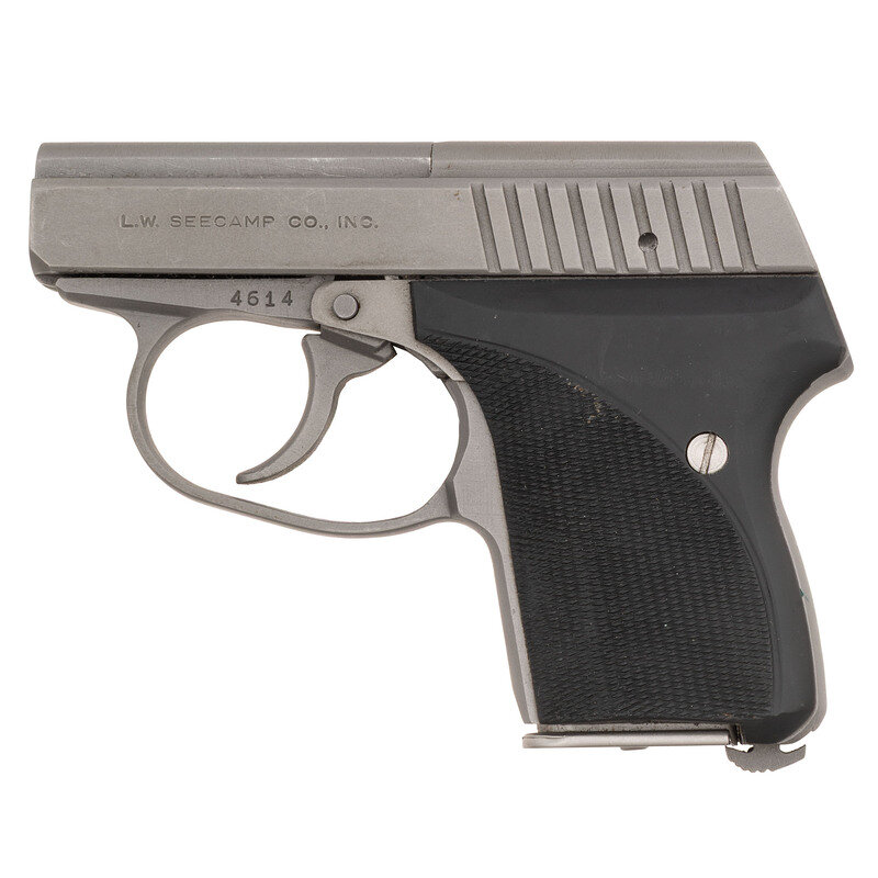 .25 ACP. 2" barrel length. SN: 4614. Matte stainless steel finish overall mounting checkered black synthetic grips with no sights. Simple blowback operated DAO autoloading pistol fed by detachable single stack magazines. Left slide shows maker marking L.W. SEECAMP CO., INC. with right barrel struck 25ACP-LWS-MILFORD, CT. Comes in original cardboard box with owner's manual, warranty card, and one spare magazine. This gun is consecutively serial numbered with the following lot. {MODERN}