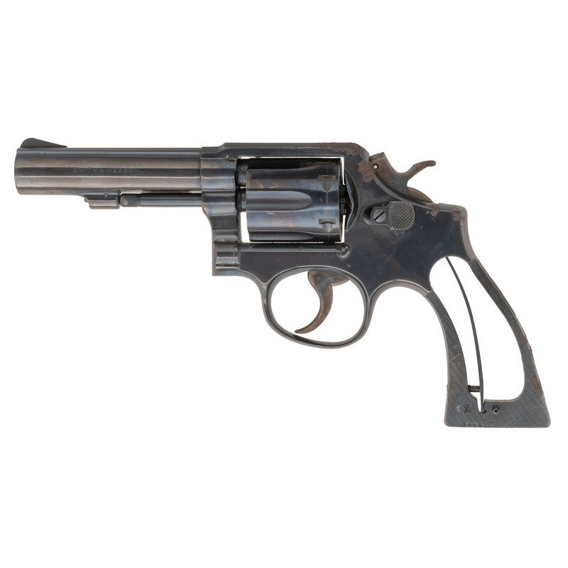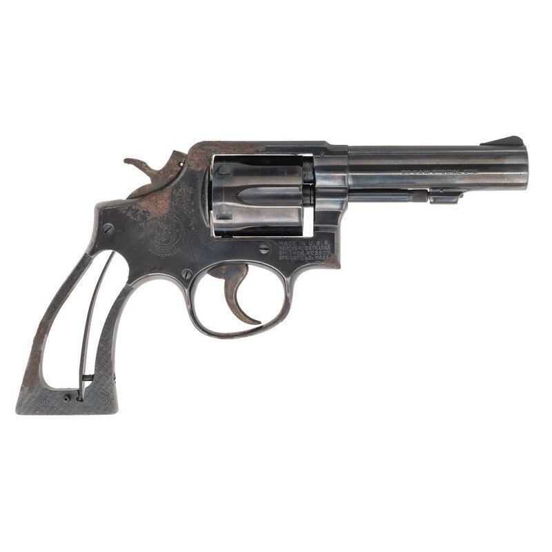 .38 Special. 4" barrel length. SN: D185364. Blued metal finish with color casehardened hammer and trigger mounting topstrap notch and matted front ramp sights. Double action six-shot hand ejector revolver with pinned barrel on a three screw frame. Standard make and model markings with a heavy barrel and matted finish to the upper flats. Item lacks grips, and shows signs of poor storage. {MODERN}
